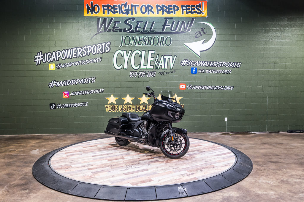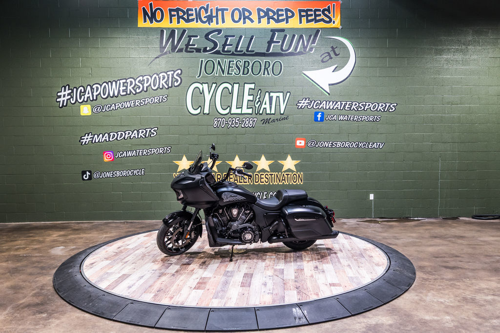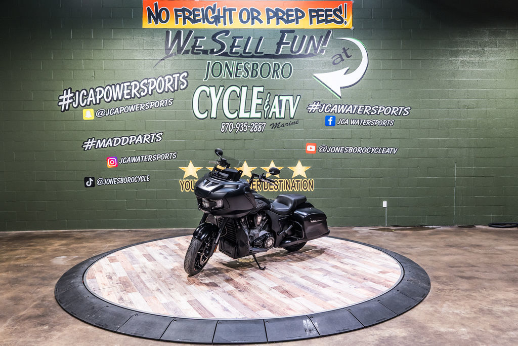 BLACK ON BLACK ON BLACKThe Indian Challenger Dark Horse has unbridled power and a style that never bows down. Premium features, and an aggressive, blacked-out silhouette, ensure heads turn wherever it roams.