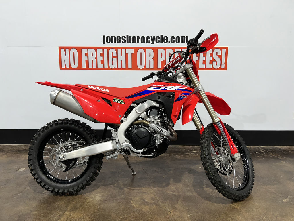 HANDLINGThe CRF450X uses a twin-spar aluminum chassis that takes advantage of all the lessons we’ve learned on the MX track and from winning countless Bajas. The frame is both light and stiff, and provides the basis for the CRF450X’s excellent handling. The chassis is also wider than the standard MX frame to accommodate the six-speed transmission.