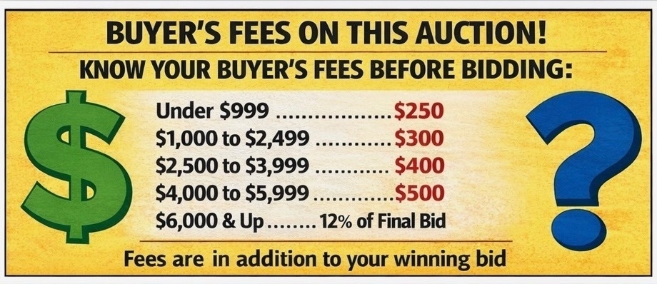 BUYER FEES (IMPORTANT – PLEASE READ) We charge a buyer’s fee in addition to the final bid price. Please be aware that your winning bid will have the following buyer’s fee added to the final purchase price. Be mindful of this when bidding. • Sale price under $999.00 – $250.00 • $1,000 to $2,499 – $300.00 • $2,500 to $3,999 – $400.00 • $4,000 to $5,999 – $500.00 • $6,000 or higher – 12% of final bid price Buyer’s fees are non-negotiable. If you do not agree with these terms, please do not bid. |