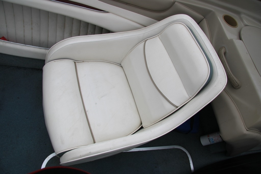 BOAT IS WHITE WITH WHITE LEATHER SEATS WITH WEAR