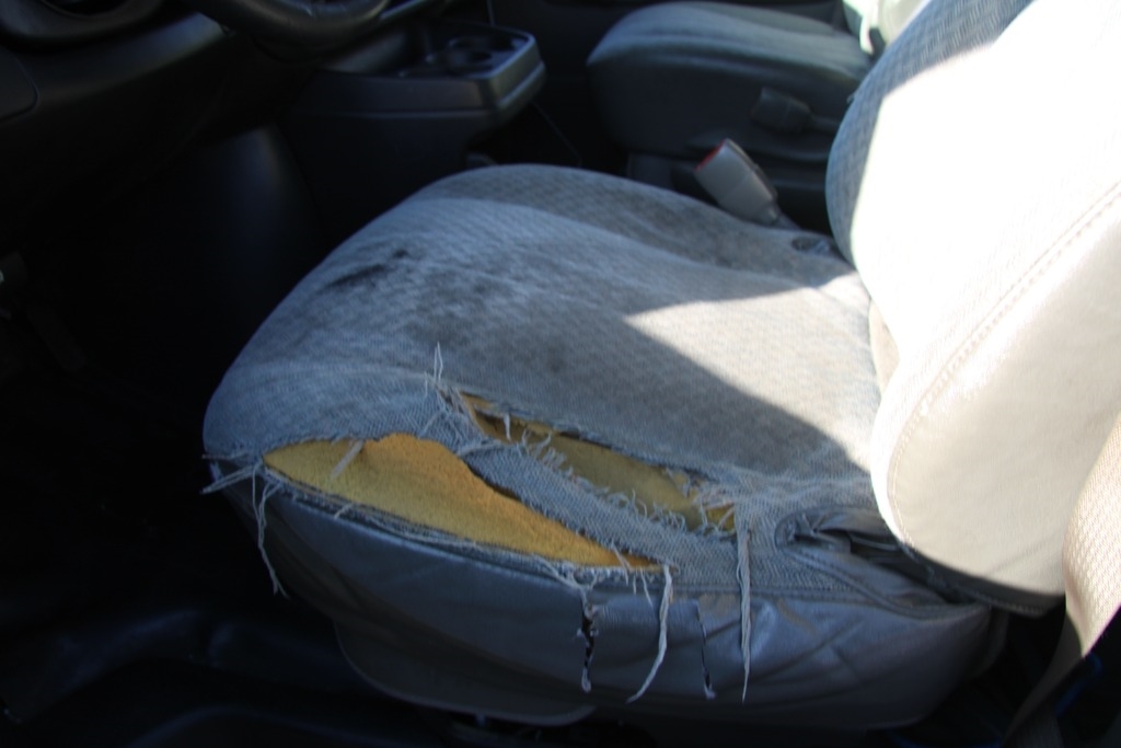 GRAY CLOTH INTERIOR WITH SIGNIFICANT WEAR (PLEASE OBSERVE INTERIOR PHOTOS)