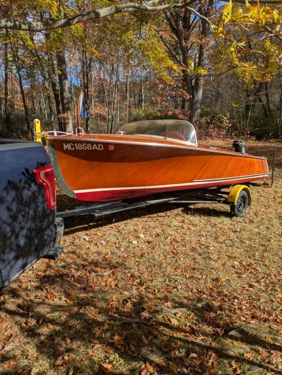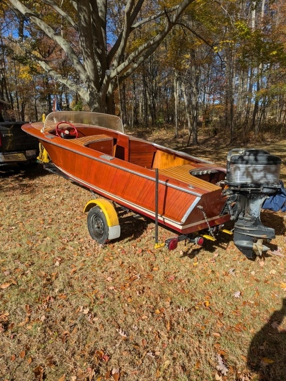 mahogany runabout, paired with a 50 HP Mercury outboard engine and a 1956 Ajax