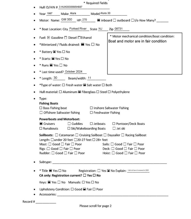 The owner says that the boat and motor are in fair condition and that it ran last in October 2024.