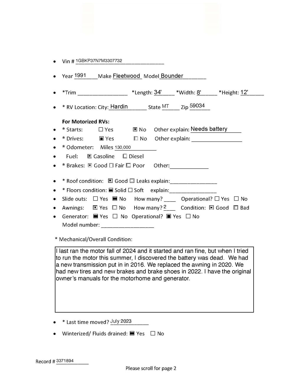 1991 Fleetwood 34’ Bounder Class A Motorhome