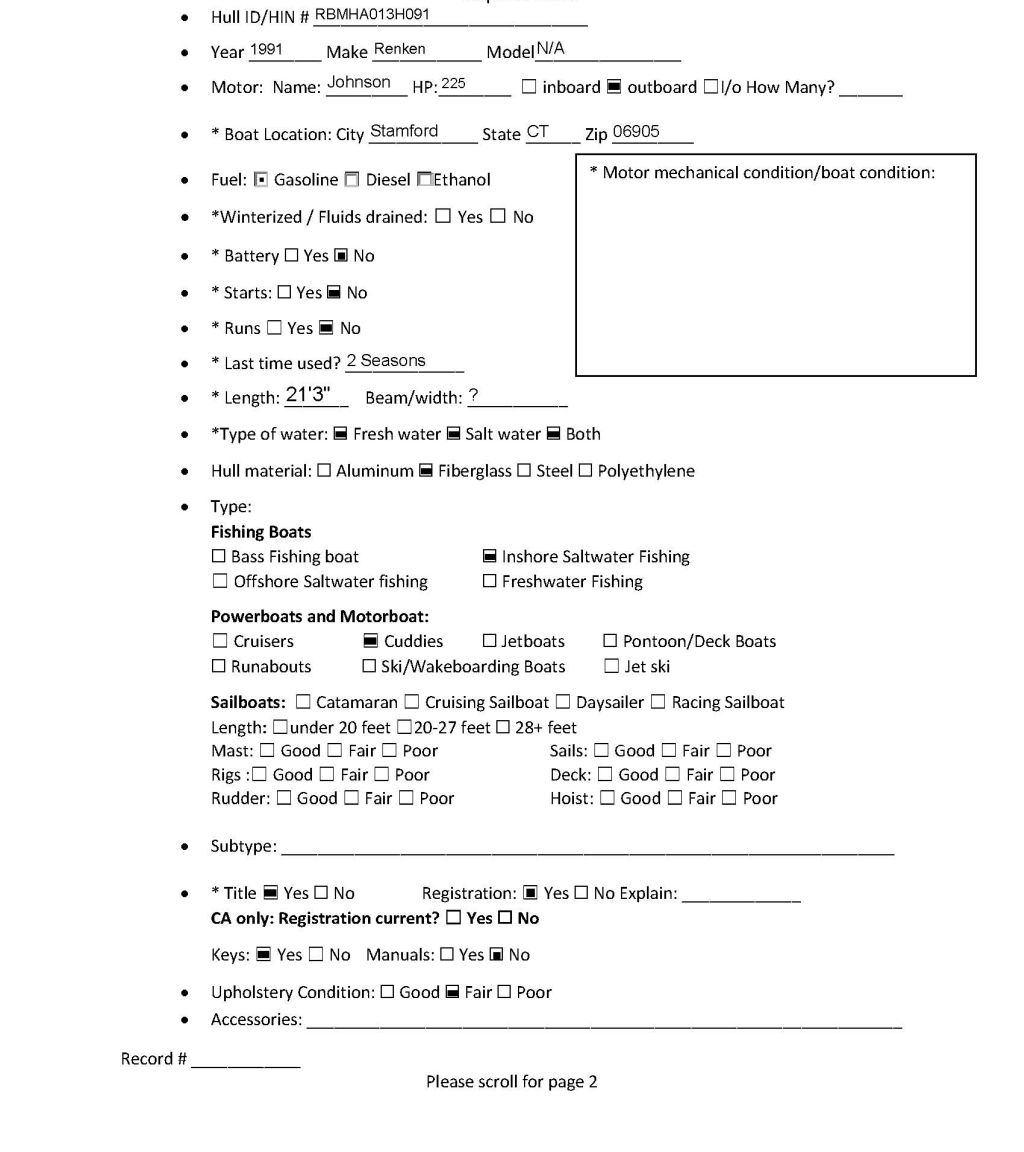 1991 Renken 21’ Boat with Johnson 225HP Outboard