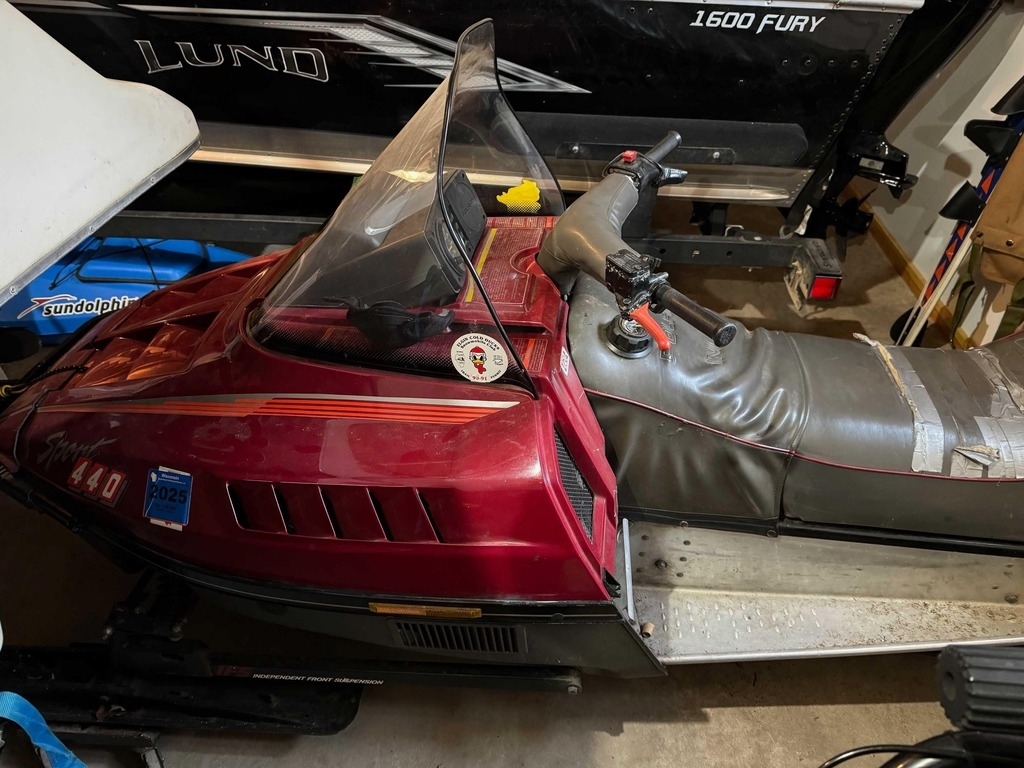 This snowmobile was garage-kept until a month ago and then covered outside. Carburetor was cleaned this year. There is a leak in the oil line.