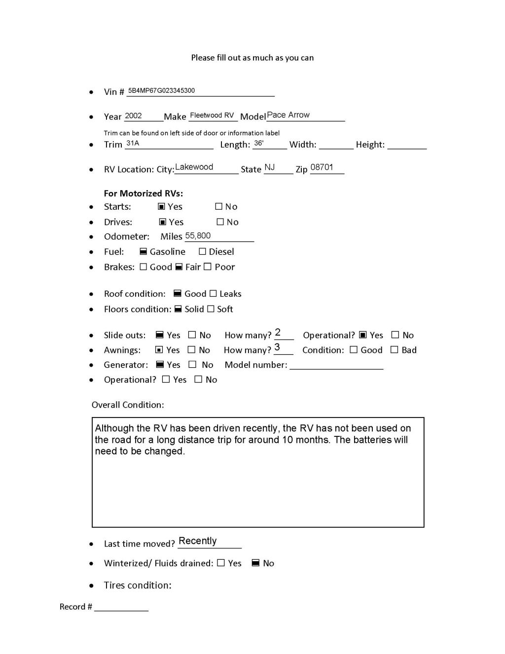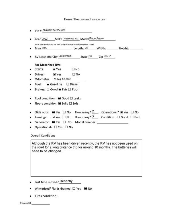 The condition of the motor home is good. It runs well