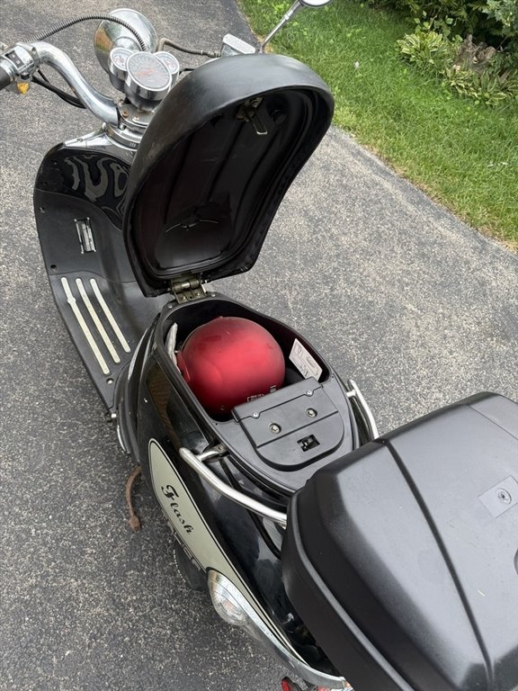 This scooter runs a 149cc / 150CC I1 gasoline engine. It hasn’t been driven since 2023 and does not currently run due to a dead battery, but it was running properly before storage. Fluids were drained. Lights and dashboard function normally 💡. Kickstand works properly.