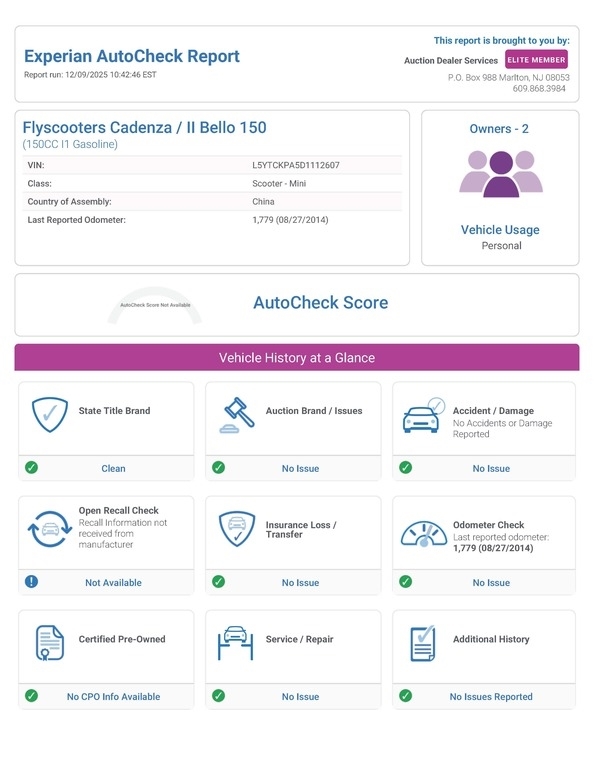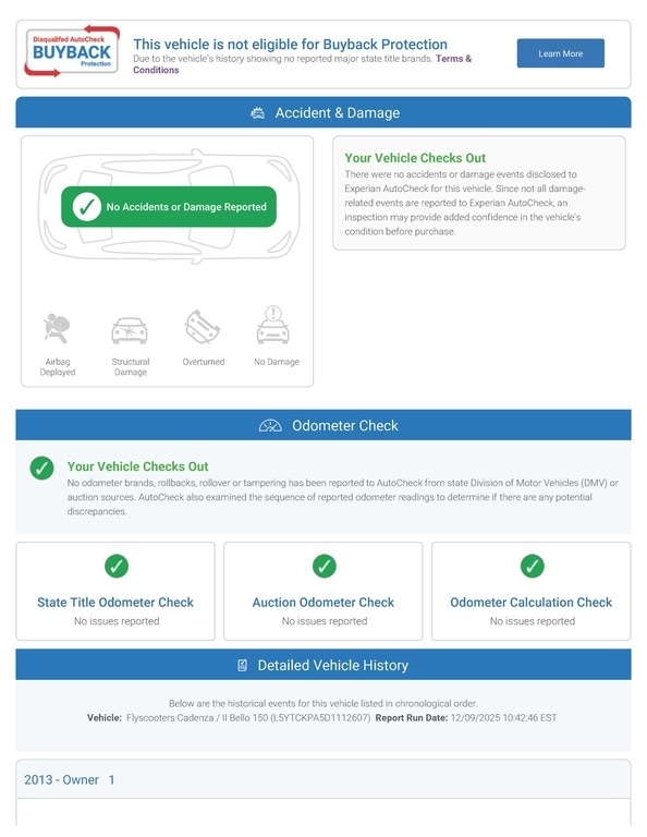 For sale is a 2013 ZHNG / Flyscooters Cadenza II Bello 150 scooter powered by a 150CC I1 gasoline engine, showing only 2,611.5 miles. It has been garage kept 🏠 and lightly used. Last started and driven in 2023. The battery is currently dead, but the owner states it should start and run once a new battery is installed 🔋.
