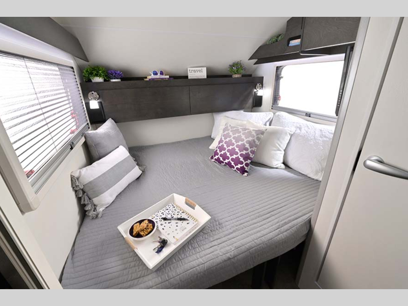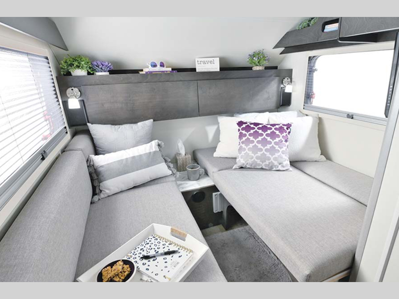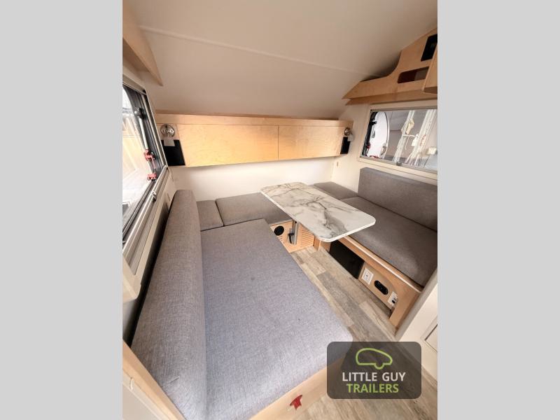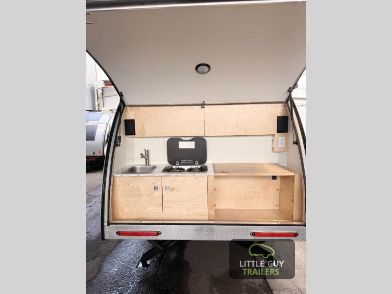 When you enjoy cooking outdoors, traveling light, and sleeping indoors, this teardrop trailer makes sense! From the well-equipped exterior kitchen in the rear hatch, the wet bath and the U-shaped dinette that offers two sleeping configurations, you will have everything you need. You can choose to setup a full bed or split beds, keep your electronics charged with the dual 110/USB ports, and make warm meals outdoors using the two burner glass-top stove, plus the 12V refrigerator will hold your cold items and such. And the wet bath or the external shower will keep you clean and refreshed while camping.