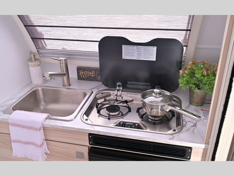 With any TAB 320 teardrop trailer by nüCamp RV, the interior offers premium soft-close cabinetry, a front window, plus a wet bath with a cassette toilet and a molded sink. They are also built with composite flooring and a molded underbelly shield for protection against rock and debris during your journeys. The iconic teardrop design offers an easy-to-tow unit with amenities found in much bigger trailers. Some other highlights include the Alde heating/hot water system, the central air conditioner, 180 watt solar panel, and the Nautilus water system with an external shower.
