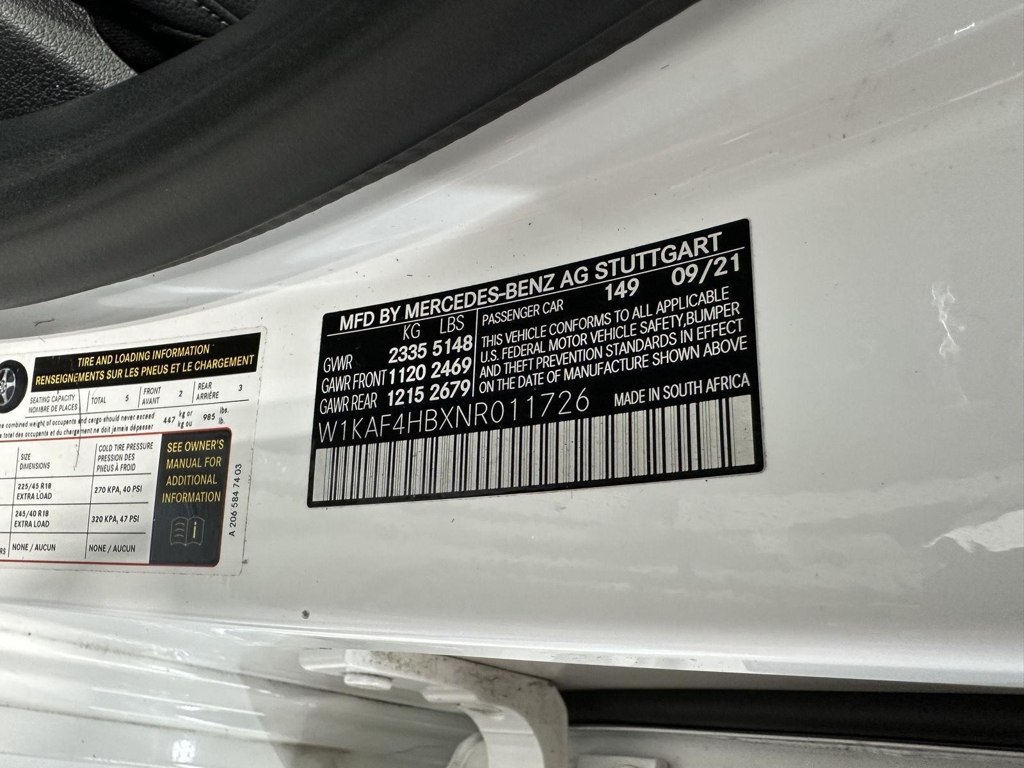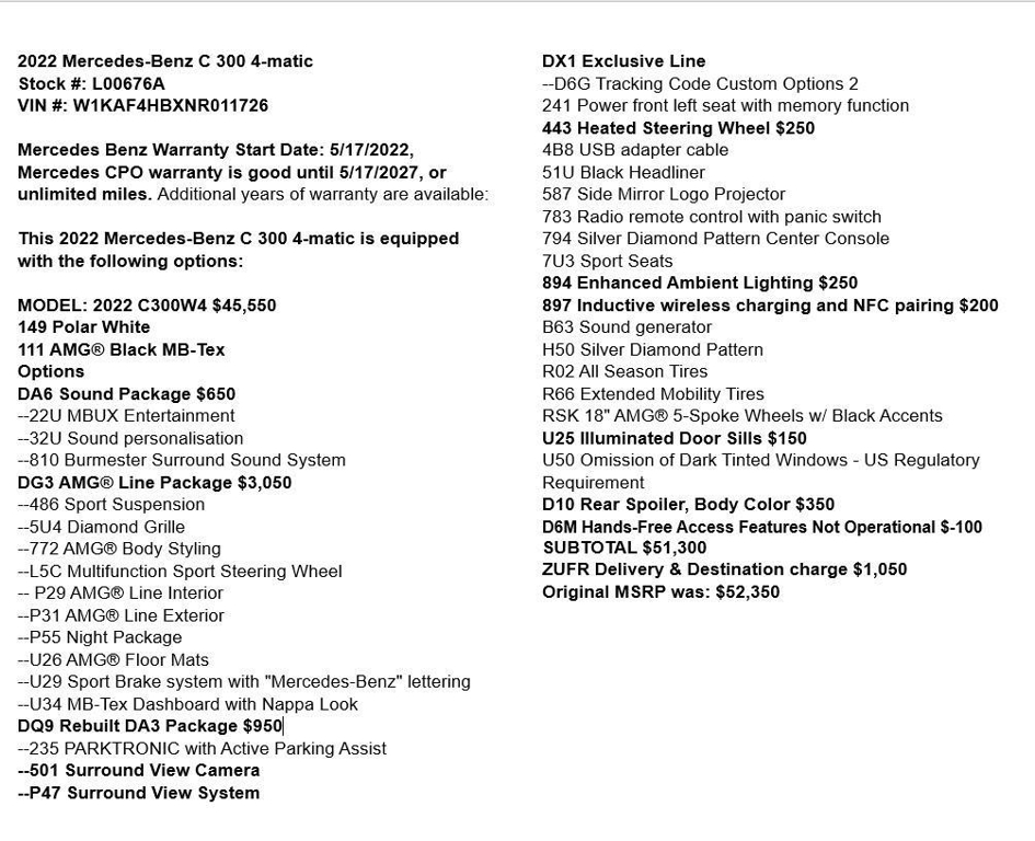 2022 Mercedes-Benz C 300 4-matic Stock #: L00676A VIN #: W1KAF4HBXNR011726 Mercedes Benz Warranty Start Date: 5/17/2022, Mercedes CPO warranty is good until 5/17/2027, or unlimited miles. Additional years of warranty are available: This 2022 Mercedes-Benz C 300 4-matic is equipped with the following options: MODEL: 2022 C300W4 $45,550 149 Polar White 111 AMG Black MB-Tex Options DA6 Sound Package $650 --22U MBUX Entertainment --32U Sound personalisation --810 Burmester® Surround Sound System DG3 AMG Line Package $3,050 --486 Sport Suspension --5U4 Diamond Grille --772 AMG Body Styling --L5C Multifunction Sport Steering Wheel -- P29 AMG Line Interior --P31 AMG Line Exterior --P55 Night Package --U26 AMG Floor Mats --U29 Sport Brake system with "Mercedes-Benz" lettering --U34 MB-Tex Dashboard with Nappa Look DQ9 Rebuilt DA3 Package $950 --235 PARKTRONIC with Active Parking Assist --501 Surround View Camera --P47 Surround View System DX1 Exclusive Line --D6G Tracking Code Custom Options 2 241 Power front left seat with memory function 443 Heated Steering Wheel $250 4B8 USB adapter cable 51U Black Headliner 587 Side Mirror Logo Projector 783 Radio remote control with panic switch 794 Silver Diamond Pattern Center Console 7U3 Sport Seats 894 Enhanced Ambient Lighting $250 897 Inductive wireless charging and NFC pairing $200 B63 Sound generator H50 Silver Diamond Pattern R02 All Season Tires R66 Extended Mobility Tires RSK 18" AMG 5-Spoke Wheels w/ Black Accents U25 Illuminated Door Sills $150 U50 Omission of Dark Tinted Windows – US Regulatory Requirement D10 Rear Spoiler, Body Color $350 D6M Hands-Free Access Features Not Operational $-100 SUBTOTAL $51,300 ZUFR Delivery & Destination charge $1,050 Original MSRP was: $52,350