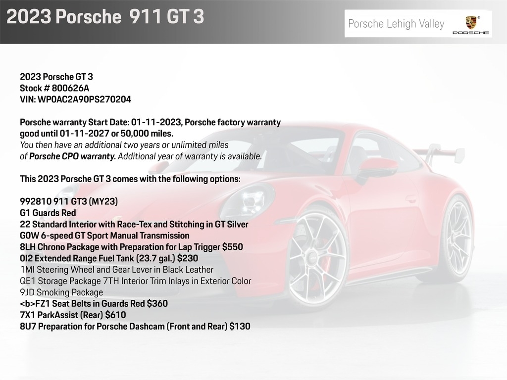 Porsche warranty Start Date: 01-11-2023, Porsche factory warranty good until 01-11-2027 or 50,000 miles.