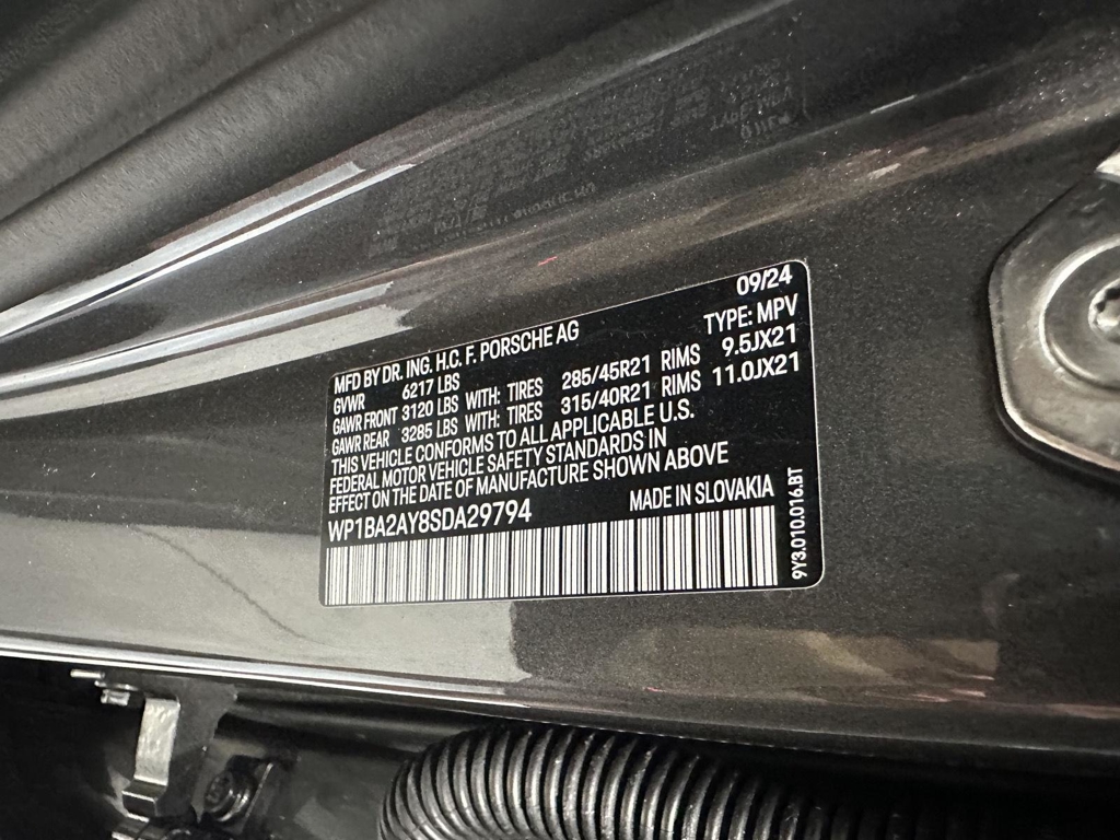 2025 Porsche Cayenne Coupe Stock # L00725 VIN: WP1BA2AY8SDA29794 Porsche warranty Start Date: 03-20-2025, Porsche factory warranty good until 03-20-2029 or 50,000 miles. You then have an additional two years or unlimited miles of Porsche CPO warranty. Additional year of warranty is available. This 2025 Porsche Cayenne Coupe comes with the following options: 9YBAI1 Cayenne Coupe $89,800 3M Quartzite Grey Metallic $800 BH Leather Interior in Black/Mojave Beige $4,190 PA1 Premium Package Plus $5,570 --Q2J Power Seats (14-way) with Comfort Memory --4A4 Heated Seats (Rear) --4D3 Ventilated Seats (Front) --9VL BOSEĀ® Surround Sound System --8IU HD-Matrix Design LED Headlights --9AE 4-Zone Climate Control --PV3 Adaptive Cruise Control incl. Lane Keep Assist (LKA) 2D4 SportDesign Front Fascia $3,610 YMY Model Designation on Doors in Neodyme $290 0P6 Sport Tailpipes in Dark Bronze $950 57Q 21" RS Spyder Design Wheels $2,710 2PJ Heated GT Sport Steering Wheel in Leather $320 5ZF Porsche Crest on Headrests (Front and Rear) $600 3NS Rear Comfort Seats (2+1) 7TE Interior Trim in Eucalyptus $640 GT1 Interior Accents in Neodyme $650 FC1 Preparation for Exclusive Order UD1 Under Door Puddle Light Projectors $320 9JB Smoking Package Total Retail Vehicle Price: $110,450 Delivery, Processing and Handling Fee: $1,995 Total of Charges & Taxes: $1,995 Original MSRP was:: $112,445