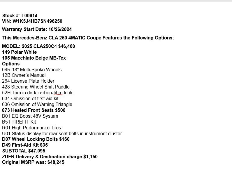 *Stock #:L00614VIN:W1K5J4HB7SN496250*Was $47,995, Warranty Start Date: 10/26/2024, Mercedes-Benz Certified Warranty is good until 10/26/2029 or unlimited miles. Additional years are available. Carfax Guaranteed. *This Mercedes-Benz CLA 250 4MATIC Coupe Features the Following Options:**MODEL: 2025 CLA250C4 $46,400149 Polar White105 Macchiato Beige MB-Tex*Options04R 18" Multi-Spoke Wheels12B Owners Manual264 License Plate Holder428 Steering Wheel Shift Paddle52H Trim in dark carbon-fibre look634 Omission of first-aid kit636 Omission of Warning Triangle*873 Heated Front Seats $500*B01 EQ Boost 48V SystemB51 TIREFIT KitR01 High Performance TiresU01 Status display for rear seat belts in instrument cluster*D07 Wheel Locking Bolts $160D49 First-Aid Kit $35SUBTOTAL $47,095ZUFR Delivery & Destination charge $1,150Original MSRP was: $48,245*