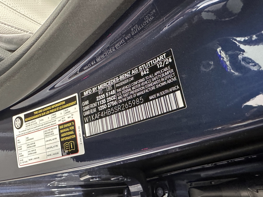 *Stock #:702271VIN:W1KAF4HB5SR265985**This Mercedes-Benz C 300 4MATIC Sedan** Comes Equipped with These Options:**MODEL: 2025 C300W4 $50,450842 Twilight Blue Metallic $750118 AMG Neva Grey MB-Tex*Options*DG3 AMG Line w/ Night Package $3,050*--486 Sport Suspension--5U4 Diamond Grille--772 AMG Body Styling--7U3 Sport Seats--B63 Sound generator--L5C Multifunction Sport Steering Wheel-- P29 AMG Line Interior--P31 AMG Line Exterior--P55 Night Package--U26 AMG Floor Mats--U29 Sport Brake system with "Mercedes-Benz" lettering-- U34 MB-Tex Dashboard with Nappa Look*DX1 Exclusive Line $2,250*-- 32U Sound personalisation--810 Burmester® Surround Sound System--894 Enhanced Ambient Lighting--P47 Surround View System--P82 Guard 360 Vehicle Protection Plus--PBG MBUX Navigation Premium-- PDB Advanced Plus Package01U Pre-installation for Navigation Services12B Owners Manual16U Apple CarPlay?17U Android Auto249 Auto-dimming Driver and Rearview Mirrors264 License Plate Holder365 MB Navigation367 Live Traffic*413 Panorama Sunroof $1,000443 Heated Steering Wheel $250*500 Power Folding Mirrors501 Surround View Camera517 HD Radio51U Black Headliner587 Side Mirror Logo Projector679 Product protection-partial protection783 Radio remote control with panic switch805 Technical modifications871 HANDS FREE ACCESS986 Identification label with VIN number989 VIN Code*H04 Natural Grain Black Wood w/ Aluminum Lines $200*PAV Winter PackageR02 All Season TiresR66 Extended Mobility TiresRSK 18" AMG 5-Spoke Wheels w/ Black AccentsU01 Rear belt status indication in the instrument displayU25 Illuminated Door SillsU50 Omission of Dark Tinted Windows -- US Regulatory Requirement*D10 Rear Spoiler, Body Color $350SUBTOTAL $58,300*Burmester is a registered trademark of Burmester Audiosysteme GmbH, Berlin, Germany.
