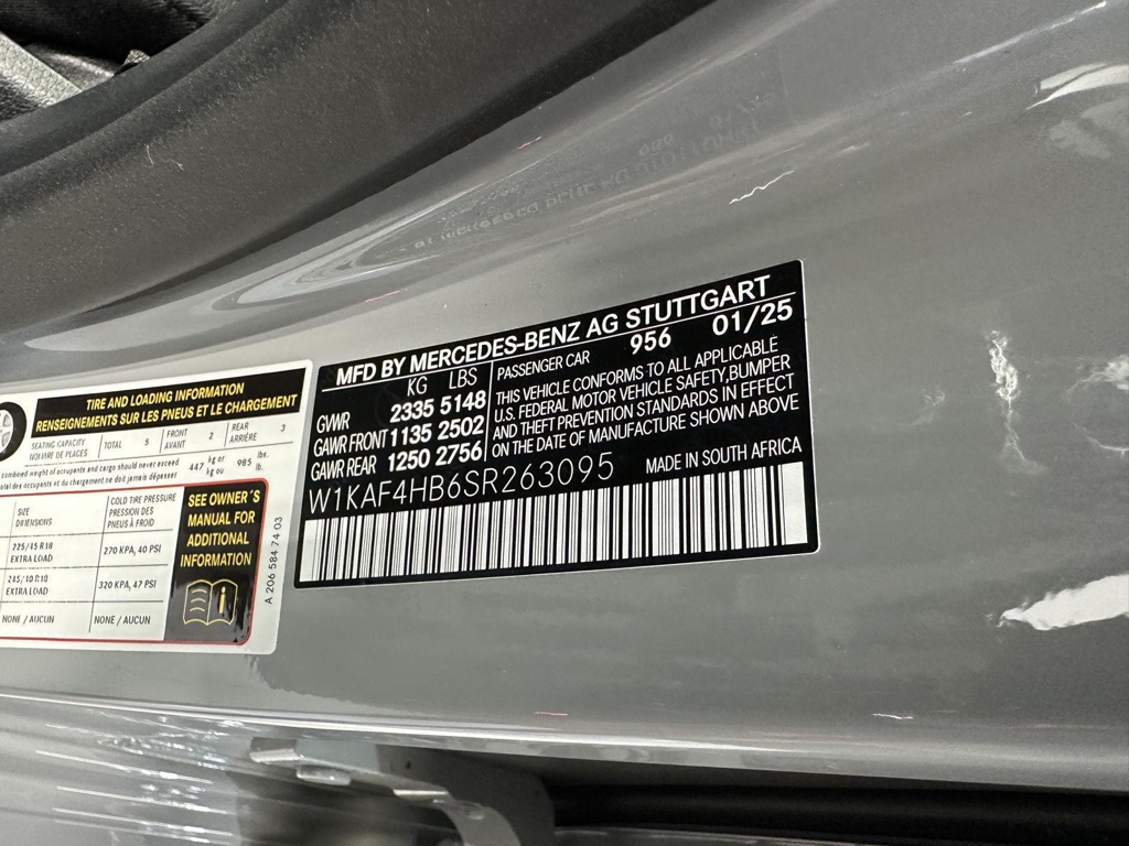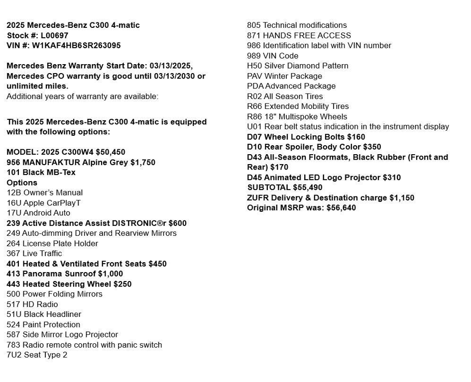 2025 Mercedes-Benz C300 4-matic Stock #: L00697 VIN #: W1KAF4HB6SR263095 Mercedes Benz Warranty Start Date: 03/13/2025, Mercedes CPO warranty is good until 03/13/2030 or unlimited miles. Additional years of warranty are available: This 2025 Mercedes-Benz C300 4-matic is equipped with the following options: MODEL: 2025 C300W4 $50,450 956 MANUFAKTUR Alpine Grey $1,750 101 Black MB-Tex Options 12B Owners Manual 16U Apple CarPlay™ 17U Android Auto 239 Active Distance Assist DISTRONIC® $600 249 Auto-dimming Driver and Rearview Mirrors 264 License Plate Holder 367 Live Traffic 401 Heated & Ventilated Front Seats $450 413 Panorama Sunroof $1,000 443 Heated Steering Wheel $250 500 Power Folding Mirrors 517 HD Radio 51U Black Headliner 524 Paint Protection 587 Side Mirror Logo Projector 783 Radio remote control with panic switch 7U2 Seat Type 2 805 Technical modifications 871 HANDS FREE ACCESS 986 Identification label with VIN number 989 VIN Code H50 Silver Diamond Pattern PAV Winter Package PDA Advanced Package R02 All Season Tires R66 Extended Mobility Tires R86 18" Multispoke Wheels U01 Rear belt status indication in the instrument display D07 Wheel Locking Bolts $160 D10 Rear Spoiler, Body Color $350 D43 All-Season Floormats, Black Rubber (Front and Rear) $170 D45 Animated LED Logo Projector $310 SUBTOTAL $55,490 ZUFR Delivery & Destination charge $1,150 Original MSRP was: $56,640