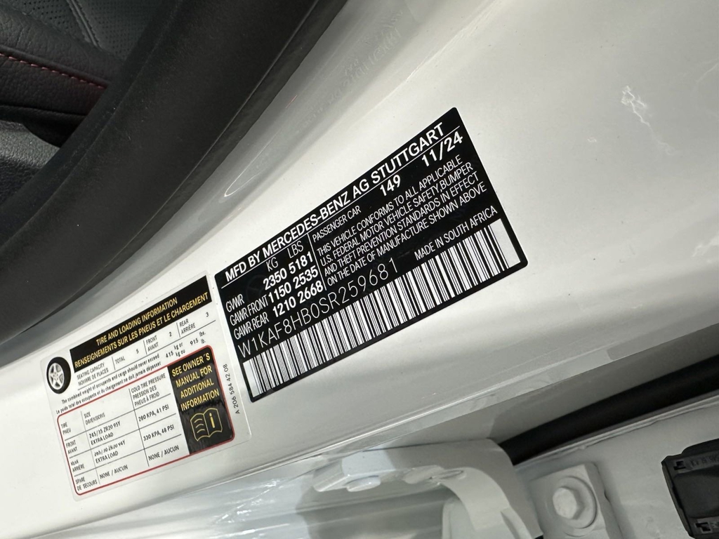 *Stock #:702111VIN:W1KAF8HB0SR259681**This Mercedes-Benz AMG C 43 4MATIC Sedan** Comes Equipped with These Options*:*MODEL: 2025 C43W4 $62,500149 Polar White251 Black Leather w/ Red Accents $1,620*Options*DC1 AMG Night Package $750*P60 AMG Exterior Night Styling*DX2 Pinnacle Line $3,650*--316 DIGITAL LIGHT--32U Sound personalisation--42U Pre-installation for projection function for symbols--43U Preinstallation for projection function for animations--444 Head-up display--810 Burmester® Surround Sound System--894 Enhanced Ambient Lighting--PAX DIGITAL LIGHT with projection function--PBG MB Navigation--PDC Premium Package--U19 Augmented Video for Navigation01U Pre-installation for Navigation Services*21U Dashcam $200*241 Power front left seat with memory function365 MB Navigation367 Live Traffic*401 Heated & Ventilated Front Seats $450413 Panorama Sunroof $1,000*608 Adaptive High Beam Assist679 Product protection-partial protection783 Radio remote control with panic switch805 Technical modifications986 Identification label with VIN number989 VIN CodeB51 TIREFIT KitH50 Silver Diamond PatternR01 High Performance Tires*RZX 20" AMG Split 10-Spoke Wheels $1,450*U01 Rear belt status indication in the instrument displayU50 Omission of Dark Tinted Windows -- US Regulatory RequirementY05 Red Seat Belts*D07 Wheel Locking Bolts $160D46 AMG Animated LED Logo Projectors $310**SUBTOTAL $72,090ZUFR Delivery & Destination charge $1,150- TOTAL - $73,240*Burmester is a registered trademark of Burmester Audiosysteme GmbH, Berlin, Germany.