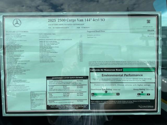 2025 Mercedes-Benz Sprinter Cargo Van 2500 144" Wheelbase High Roof Cargo Van VIN #: W1Y4KBHY5ST214979 Stock #: 900481 Exterior Color: Arctic White Interior Color: Artico Man Made Leather Black