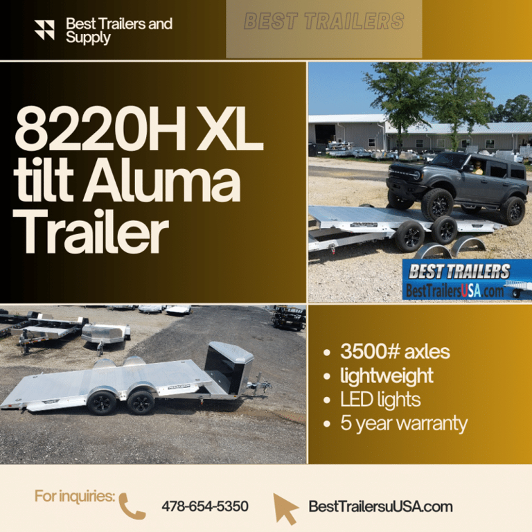 πŸ’₯ Welcome to Best Trailers & Supply – Your Ultimate Trailer Destination! πŸ’₯ πŸ“ Location: Byron, GA πŸ‘ πŸ“ž Call us at 478.654.5350 for Expert Advice and Unbeatable Deals! πŸ†“ Don’t Miss Out! Get a FREE White Wheel Spare Tire when you Pay Cash at Pick Up! πŸ†“ Aluma 20β€² Executive Tilt Car Hauler Trailer The Aluma 20β€² Executive Tilt Car Hauler Trailer is designed for durability, convenience, and style. With premium aluminum construction and advanced tilt technology, this trailer provides effortless loading and secure transport for vehicles and equipment. Key Features: Lightweight & Stron 1975 lb curb weight for easy towing 2-5200# rubber torsion axles with easy-lube hubs for smooth performance Electric brakes and breakaway kit for added safety Sleek & Functional Design: 40β€³ spread axle for stability and smooth towing Removable fenders for easy side loading Black aluminum wheels (5-4.5 BHP) for a modern, aggressive look Built for Easy Loadin Extruded aluminum floor for durability Full-length side steps for convenient access Hydraulic tilt deck for effortless vehicle loading Storage & Security: 42β€³H x 82β€³W x 34β€³L cargo storage box for extra gear and tools Six recessed SS 5000# tie rings for secure load fastening Lighting & Safety: LED GLO lighting package for high visibility Five marker lights per side and eight bed lights for nighttime loading Safety chain loops and receptacle holder for added security Specifications: Overall Width: 101.5β€³ Overall Length: 320β€³ / 344β€³ The Aluma 20β€² Executive Tilt Car Hauler Trailer is the perfect blend of strength, convenience, and style. Whether hauling classic cars, race cars, or equipment, this premium tilt trailer is built to handle the job efficiently and reliably. 🚚 Delivery Available at $2 per Loaded Mile! 🚚 πŸ“ž For any questions, concerns, or info on this trailer, don’t hesitate to call our dedicated sales team at 478.654.5350! πŸ“ Visit us at Best Trailers & Supply in Byron, GA or call 478.654.5350 for more information! 🌟
