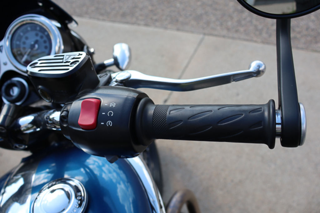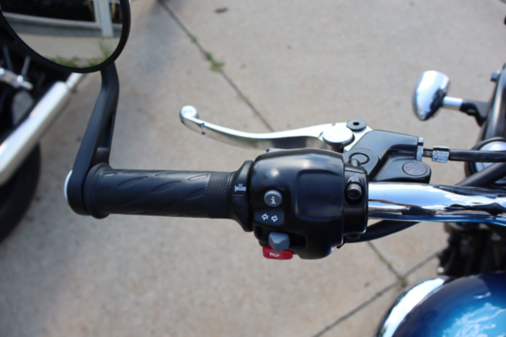 Classic Jet Black bodywork contrasts with the rich blue and chrome scheme.