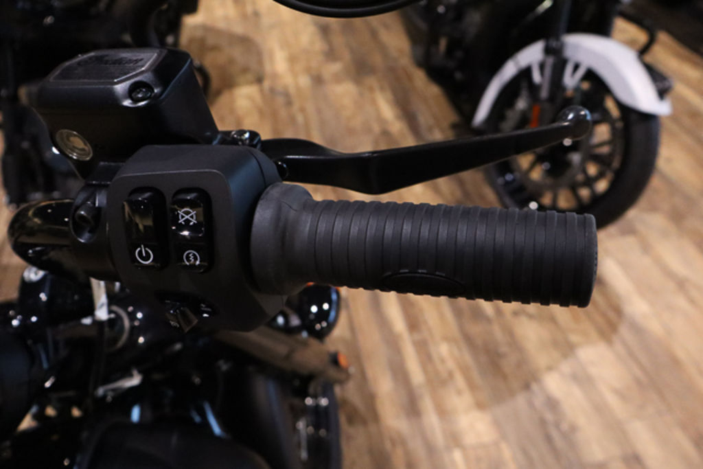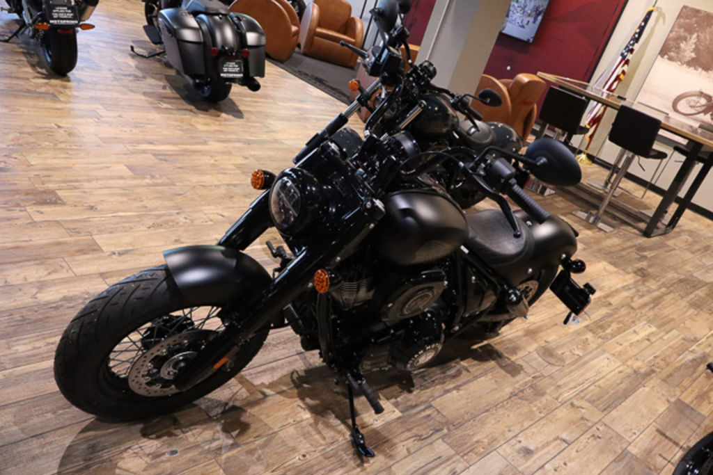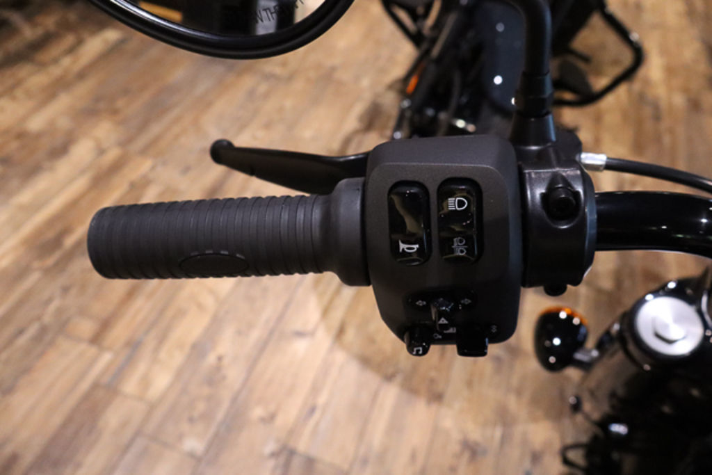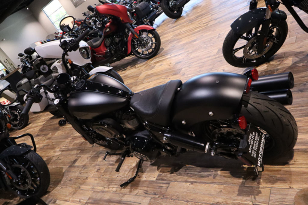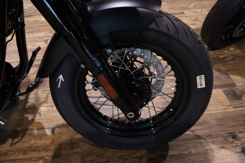 Loaded with attitude and blacked-out premium gloss black finishes with bobbed fenders. A welded steel tube frame, large headlight bucket with nacelle, and covered forks and rear shocks give a nod to traditional bobber style and deliver a visually striking experience.