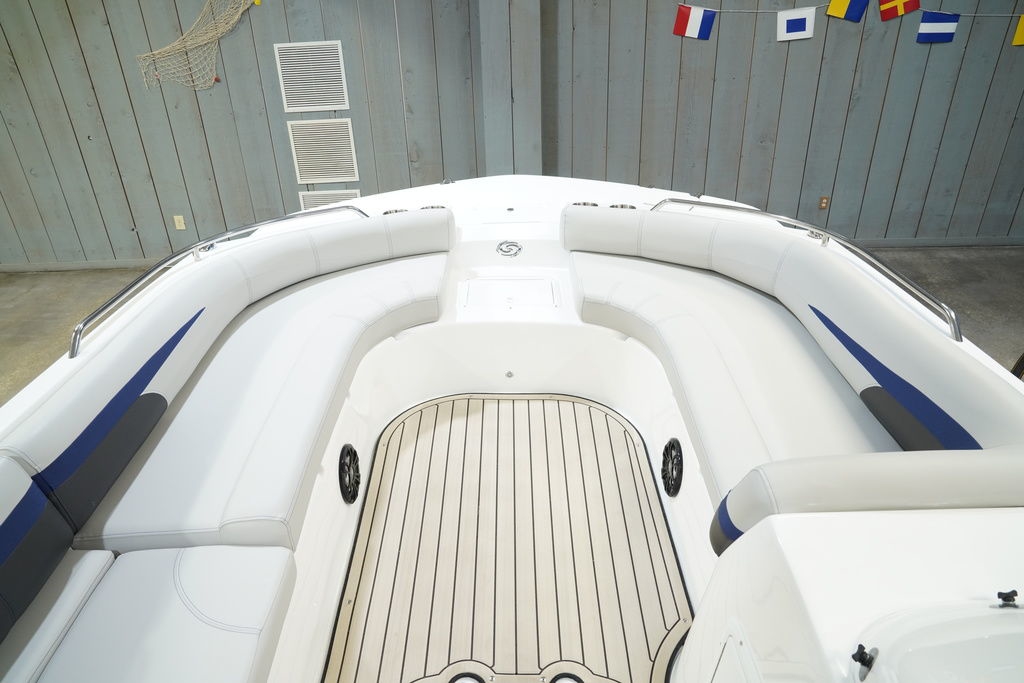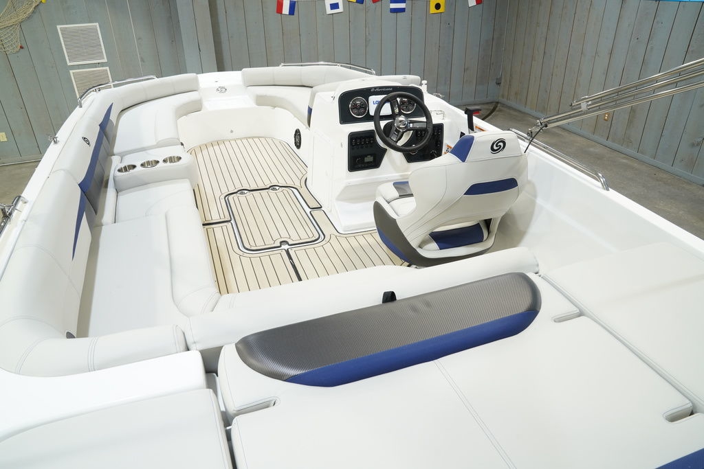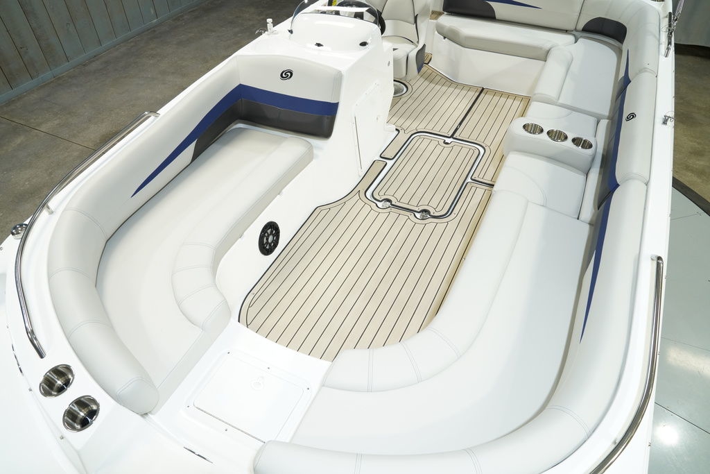 Confidence, versatility and easy maneuverability come standard. A sporty windscreen compliments an open floor plan, lounge seating and stern sun pad for more fun for more people.