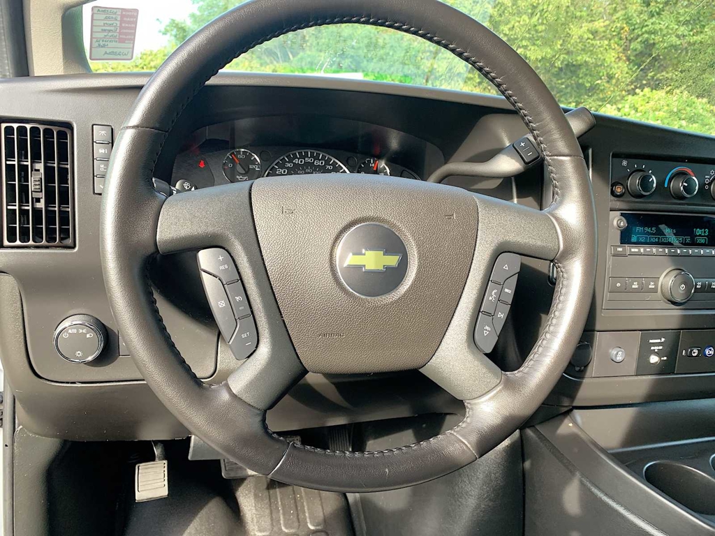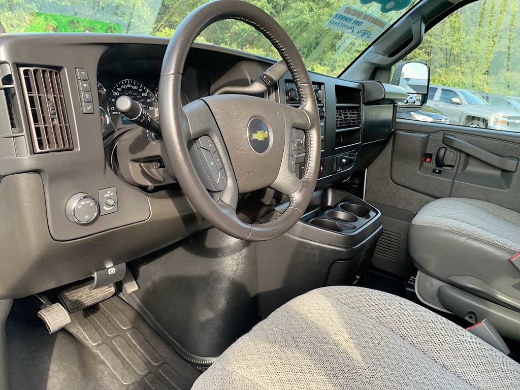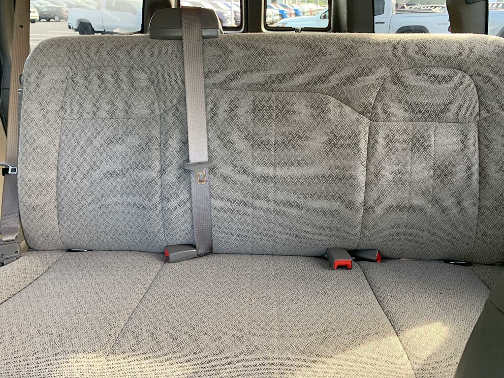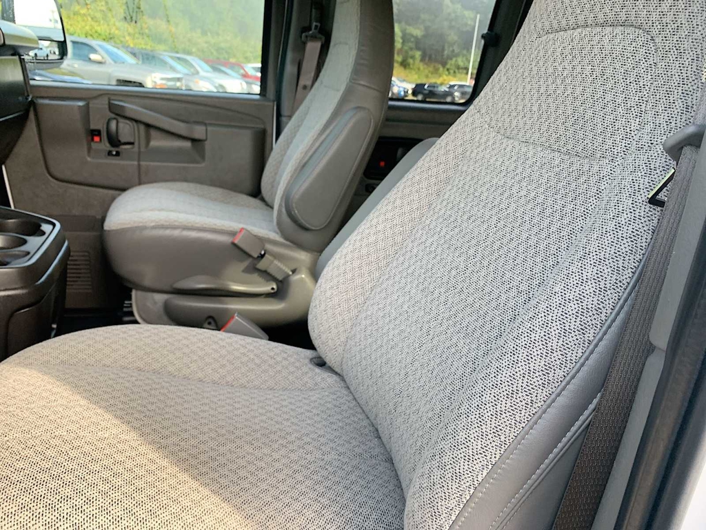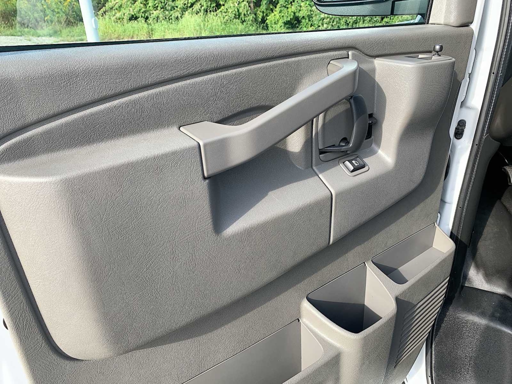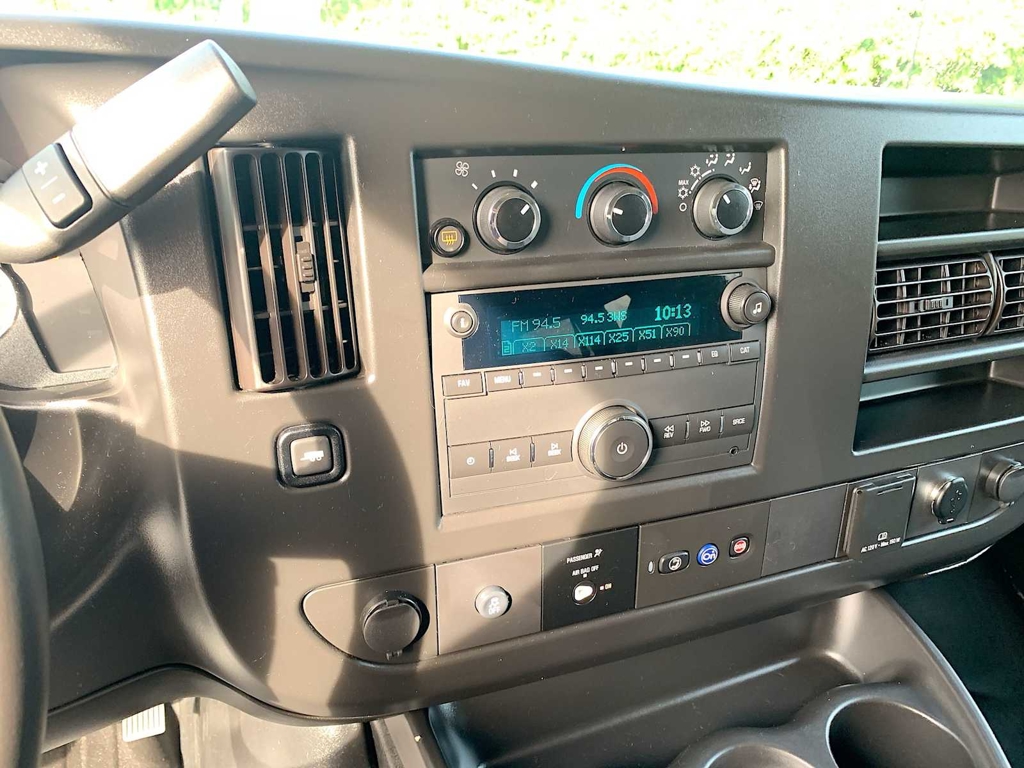 OPTION PACKAGES SEATING ARRANGEMENT, 5-PASSENGER, EXPRESS CREW VAN PACKAGE (Includes 2-row coverage for roof-rail mounted head-curtain airbags.) Includes (ASF) airbags with enhanced technology glass in side rear windows (see Owners Manual), (PNC) Door Trim Panel Package, (B38) full-length Black rubberized-vinyl floor covering, (ZW6) full-body window package glass, (C69) rear air conditioning, (TR9) auxiliary lighting and (93W/93G) Medium Pewter interior. DRIVER CONVENIENCE PACKAGE includes Tilt-Wheel and (K34) cruise control, DIFFERENTIAL, HEAVY-DUTY LOCKING REAR, TRAILERING EQUIPMENT, HEAVY-DUTY includes trailering hitch platform and dual 4-pin/7-pin sealed connector Includes (UY7) trailer wiring.), REMOTE KEYLESS ENTRY with 2 transmitters and remote panic button, AUDIO SYSTEM, AM/FM STEREO WITH MP3 PLAYER AND USB PORT includes seek-and-scan, digital clock, TheftLock, random select, auxiliary jack and 2 front door speakers (Includes (U2K) SiriusXM Radio. GLASS, SOLAR-RAY DEEP-TINTED (all windows except light-tinted glass on windshield and driver- and front passenger-side glass), Bluetooth® FOR PHONE, PERSONAL CELL PHONE CONNECTIVITY TO VEHICLE AUDIO SYSTEM, ENGINE, 4.3L V6 with Direct Injection and Variable Valve Timing, includes aluminum block construction (276 hp [206 kW] @ 5200 rpm, 298 lb-ft of torque [404 Nm] @ 3900 rpm) (STD), TRANSMISSION, 8-SPEED AUTOMATIC, ELECTRONICALLY CONTROLLED with overdrive and tow/haul mode. Includes Cruise Grade Braking, Powertrain Grade Braking and Tap-Up/Tap-Down Driver Shift Control (STD), STEERING WHEEL CONTROLS, MOUNTED AUDIO CONTROLS. Chevrolet Express Cargo Van with Summit White exterior and Medium Pewter interior features a V6 Cylinder Engine with 276 HP at 5200 RPM*.