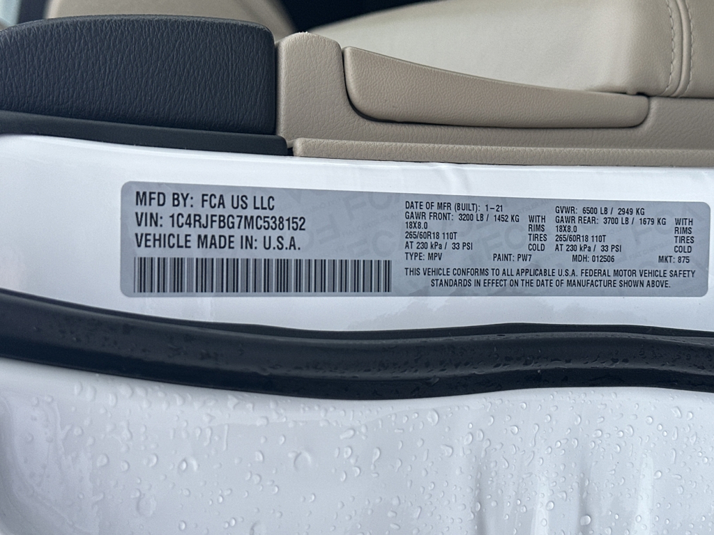 LIMITED WITH LUXURY GROUP II, PROTECH GROUP II, PREMIUM LIGHTING, OFF ROAD ADVENTURE PACKAGE, 4X4, PANORAMIC SUNROOF, GPS / NAVIGATION, REAR BACK UP CAMERA, ADAPTIVE CRUISE CONTROL, BLIND SPOT & CROSS PATH DETECTION, LANESENSE LANE DEPARTURE WARNING PLUS, PARALLEL AND PERPENDICULAR PARK ASSIST, FORWARD COLLISION WARNING PLUS, LEATHER INTERIOR, HEATED SEATS, HEATED STEERING WHEEL, VENTILATED FRONT SEATS, SATELLITE RADIO, KEYLESS ENTRY, PUSH BUTTON START, REMOTE START, SIDE AIRBAGS, POWER LIFTGATE, REAR PARK ASSIST SENSORS, UCONNECT VOICE COMMAND WITH BLUETOOTH, STEERING WHEEL MOUNTED AUDIO CONTROLS, DUAL POWER SEAT WITH DRIVER MEMORY, DUAL ZONE FRONT CLIMATE, REAR ZONE CLIMATE, FACTORY SECURITY SYSTEM, POWER TELESCOPING STEERING WHEEL, HID XENON HEADLIGHTS, ALLOYS, FOG LAMPS, TIRE PRESSURE MONITORING DISPLAY, ALL POWER AND MUCH MORE, CARFAX CERTIFIED, EXTENDED WARRANTY AVAILABLE, SOME OFFERS INCLUDE FINANCING WITH APPROVED LENDERS FOR ADVERTISED PRICE.. Bright White Clearcoat 2021 Jeep Grand Cherokee Limited 3.6L V6 24V VVT 4WDMUST MENTION OR PRESENT AD AT TIME OF PURCHASE TO RECEIVE THE ADVERTISED PRICE. Welcome to Palmer DCJR! We are proud to be a family-owned business serving the greater Roswell area for 30 years. Here at Palmer, we make customer service our top priority. We are also pleased to be able to offer a buying process that can be completed from start to finish online! We will deliver your new vehicle right to your door. Whether you are in search of your next car or looking for a service center you can trust, Palmer Dodge Chrysler Jeep Ram is the place to go. Give us a call, fill out our online form, or stop by for an incredible automotive experience today! THE ADVERTISED PRICE INCLUDES ALL INCENTIVES INCLUDING IRS EV CREDIT BUT DOES NOT INCLUDE SALES TAX, VEHICLE REGISTRATION FEES, OTHER FEES REQUIRED BY LAW, OR FINANCE CHARGES. SOME OFFERS INCLUDE FINANCING WITH APPROVED LENDERS FOR ADVERTISED PRICE. Palmer Dodge is proudly serving... Atlanta, Buckhead, Duluth, Suwanee, Alpharetta, Cumming, Gainesville, Flowery Branch, Buford, Roswell, Jasper, Canton, Woodstock, Peachtree, Ball Ground, Jefferson, Athens, Augusta, Buford, Conyers, Decatur, Tucker, Milton, Douglasville, Alpharetta, Marietta, Sandy Springs, Dunwoody, Johns Creek, Lawrenceville, Lilburn, Chamblee, Stone Mountain, Vinings, Norcross, Oakwood, Sugar Hill, Athens, Kennesaw, Dawsonville. We also service the following states... Georgia, Florida, Alabama, South Carolina, North Carolina, Mississippi, & more.