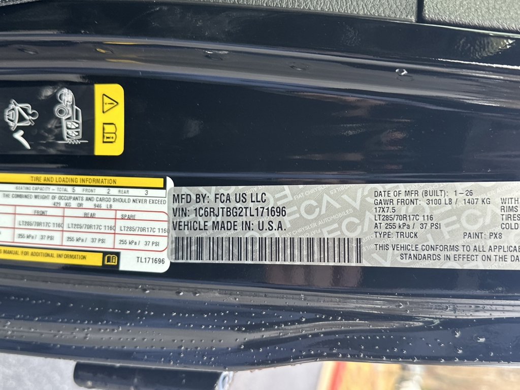 Price includes all rebates and incentives: $1000 - 2026 National Retail Bonus Cash . Exp. 03/31/2026 $1000 - 2026 National Stellantis Loyalty Bonus Cash . Exp. 03/31/2026BEDLINER, SPRAY-IN BED LINER, BACK-UP CAMERA, 4X4, LEATHER, HEATED FRONT SEATS, HEATED STEERING WHEEL, NAVIGATION, BLUETOOTH®, REMOTE START, MP3 Player, KEYLESS ENTRY, SAT RADIO, LED HEADLIGHTS, ALLOY WHEELS. MSRP: $63380 SALE Price: $56380!