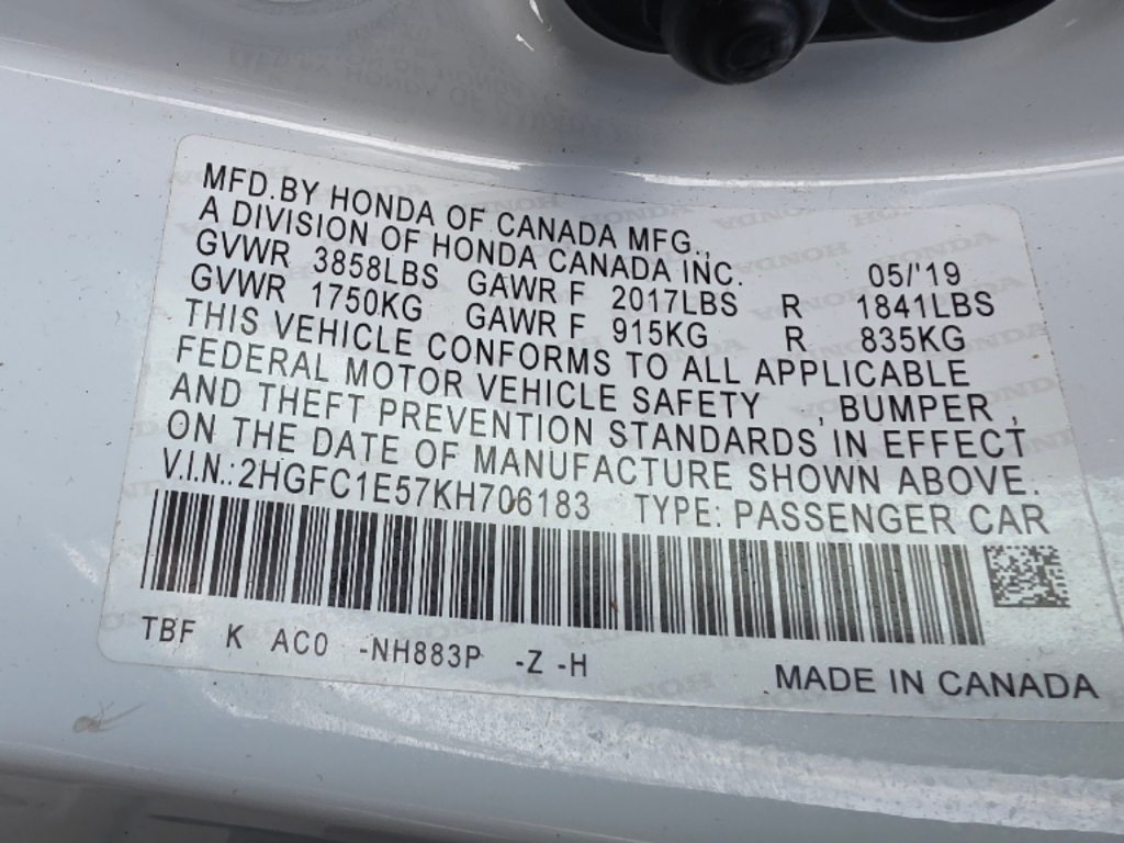 VIN Number: 2HGFC1E57KH706183