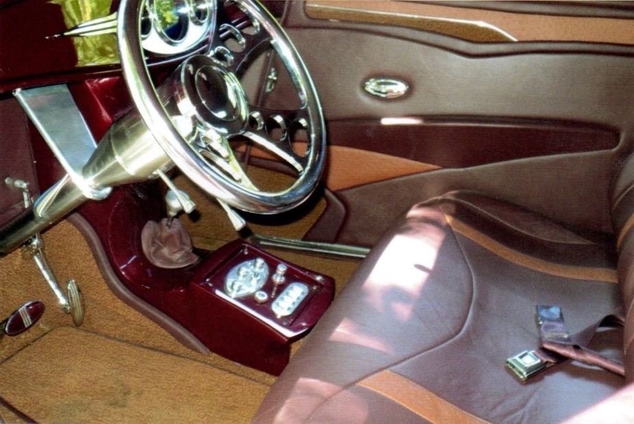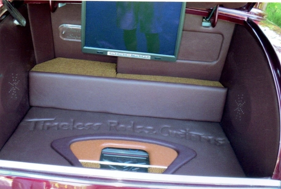 Interior: bucketback bench seat leather, Lecarra Mark 9 steering wheel polished column and drop, VDO gauges, Pioneer system with c/d receiver and custom console with kicker in the trunk back up camera and tv in trunk