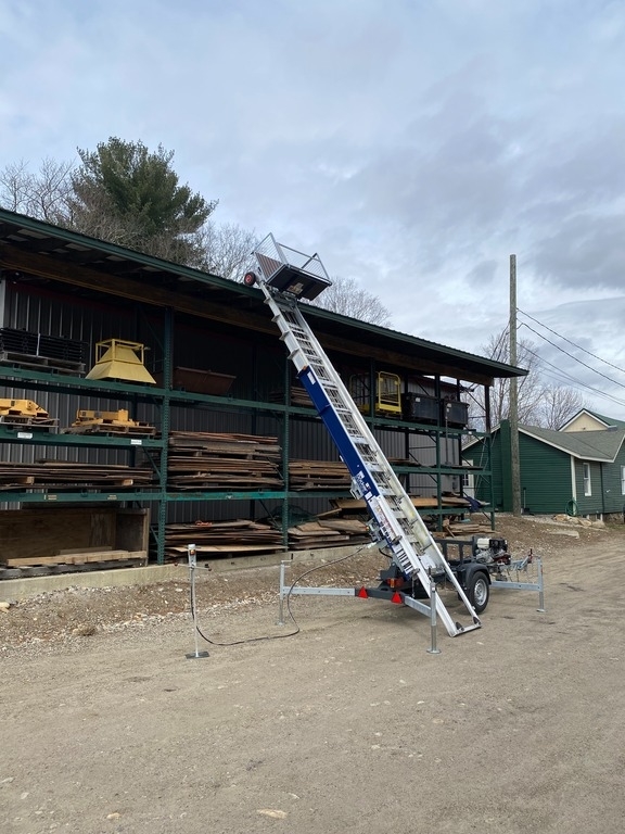 This unique inclined material lift is specifically designed for operation as a straight rail extension ladder that is mounted on an easily transportable trailer. It has a maximum of 52-foot extension and 440-pound load capacity, and it is powered by a Honda GX390 gas engine. The machine’s low transport weight and adjustable axles allows it to be towed by almost any vehicle and even fit through a 36-inch-wide opening. The carriage can move loads along the rail at up to 157 feet per minute giving it a 20 second travel time from bottom to top. All this performance can safely help work crews with roofing, masonry and carpentry, etc utilizing multiple optional load carrying platforms.