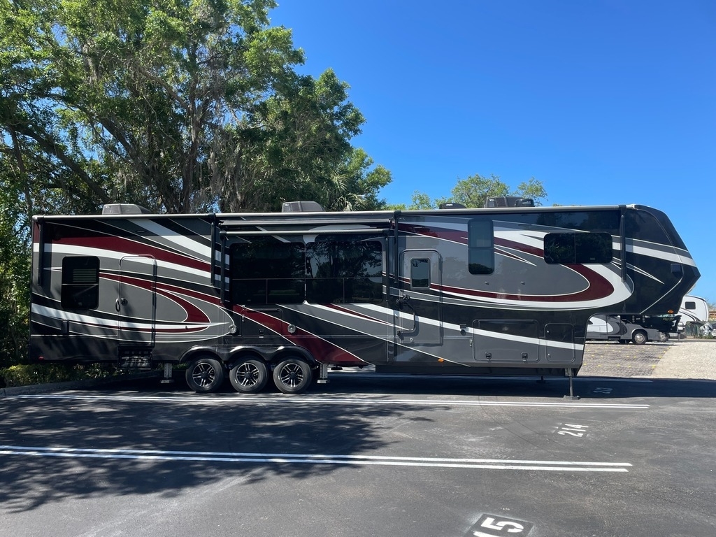 8,000 Pound Axles With Disc BrakesGreat Cooking Area: Three Burner Cooktop, Oven, Microwave/Convection Oven ComboFull Refrigerator/FreezerLarge Double Kitchen Sink In Kitchen Island With Fold Up CountertopSolid Surface Countertops & Sink CoverPantryFree Standing DinetteEntertainment Center With LED TV And FireplaceSurround SoundDVD/CD/StereoTheatre Seating Large Bathroom With Sunken Tub/Shower, Skylight, Toilet And VanityMaster King Size Bed - New MattressLED Television Full Closet/Dresser12' 6" Garage 60 Gallon Fueling Tank1/2 Bath In GarageOverhead Bed - New MattressLED Television Ramp Door/Patio Dual Entrance - Garage and Main 20 x 20 House Vents Throughout Brand New Underbelly New Suspension