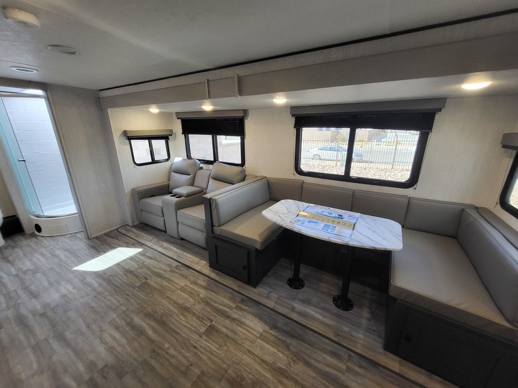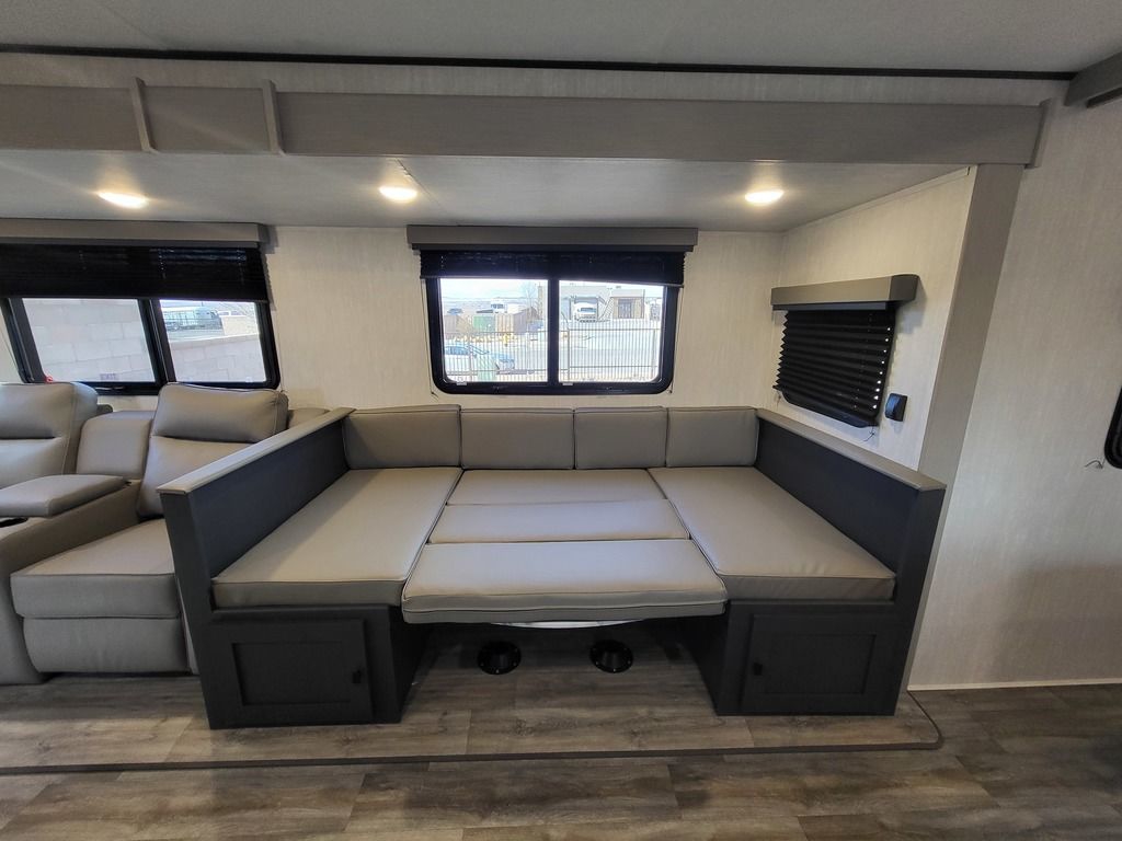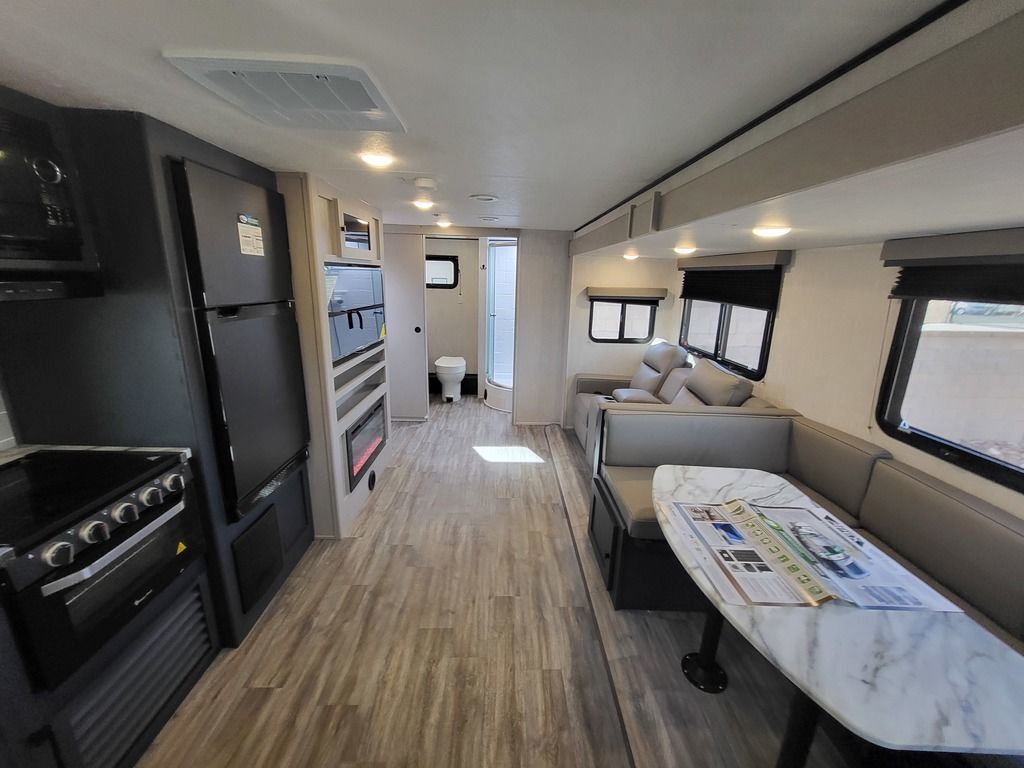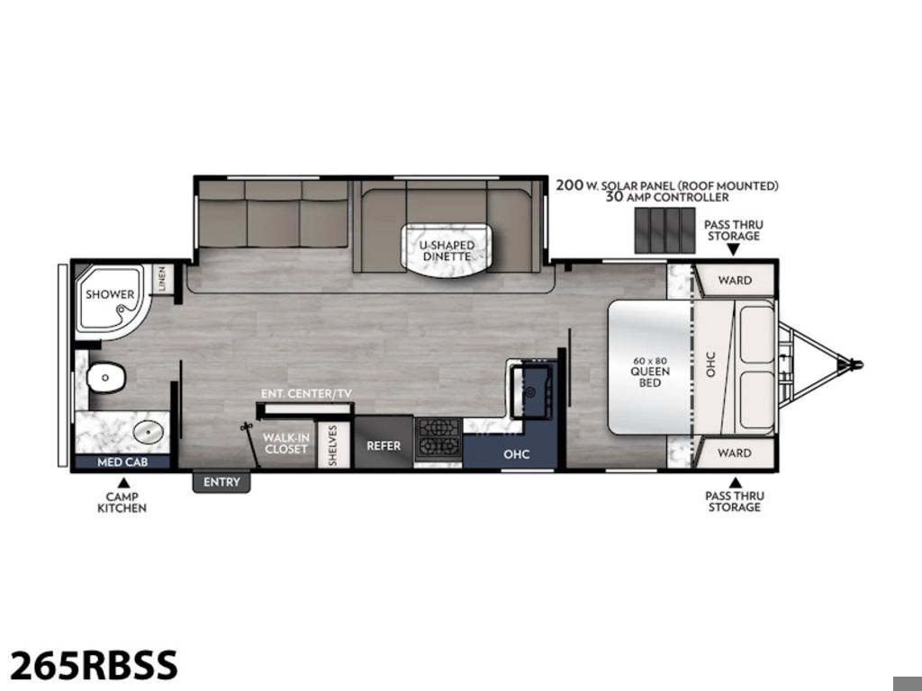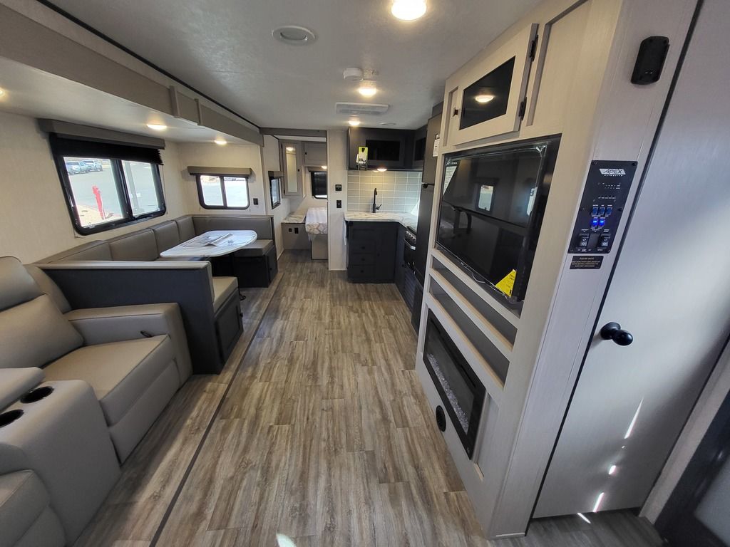Just inside the door the amenities of this 30’ coach are apparent. The full walk-in pantry provides plenty of space for coats, shoes, vacuums, etc. The rear bath has sliding door giving you more floor space. The convertible dinette can be used as a booth dinette, u-shaped dinette or extra sleeping space. The large TV is directly viewed from your hide-a-bed sofa or optional theatre seating or recliners.
