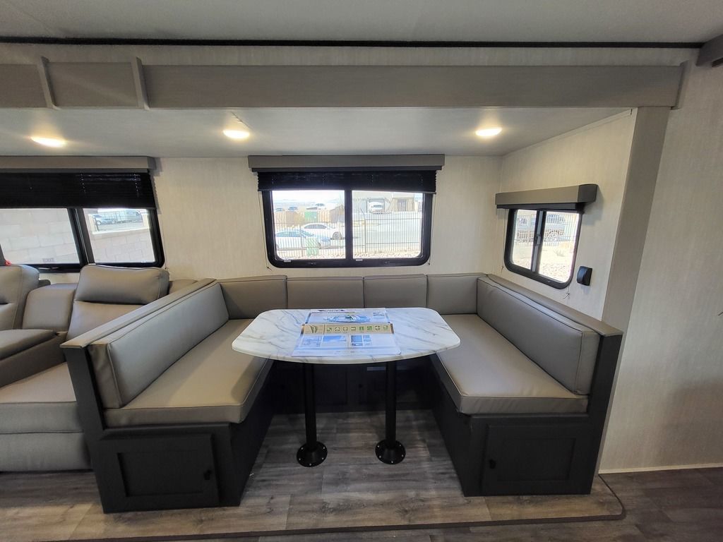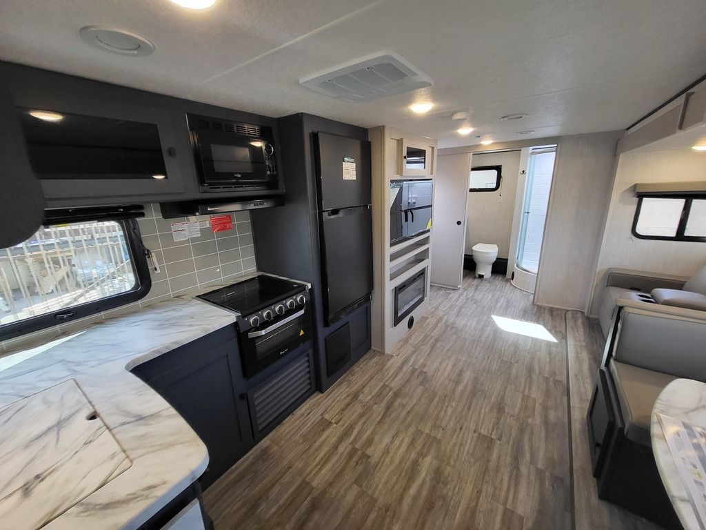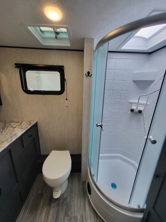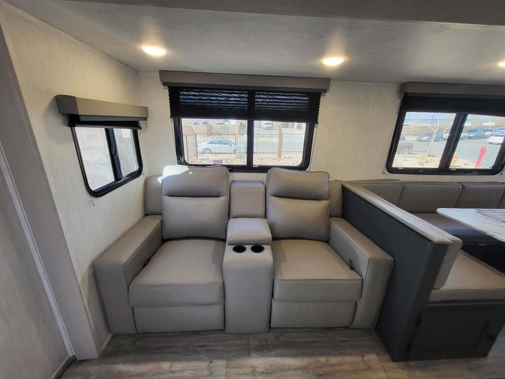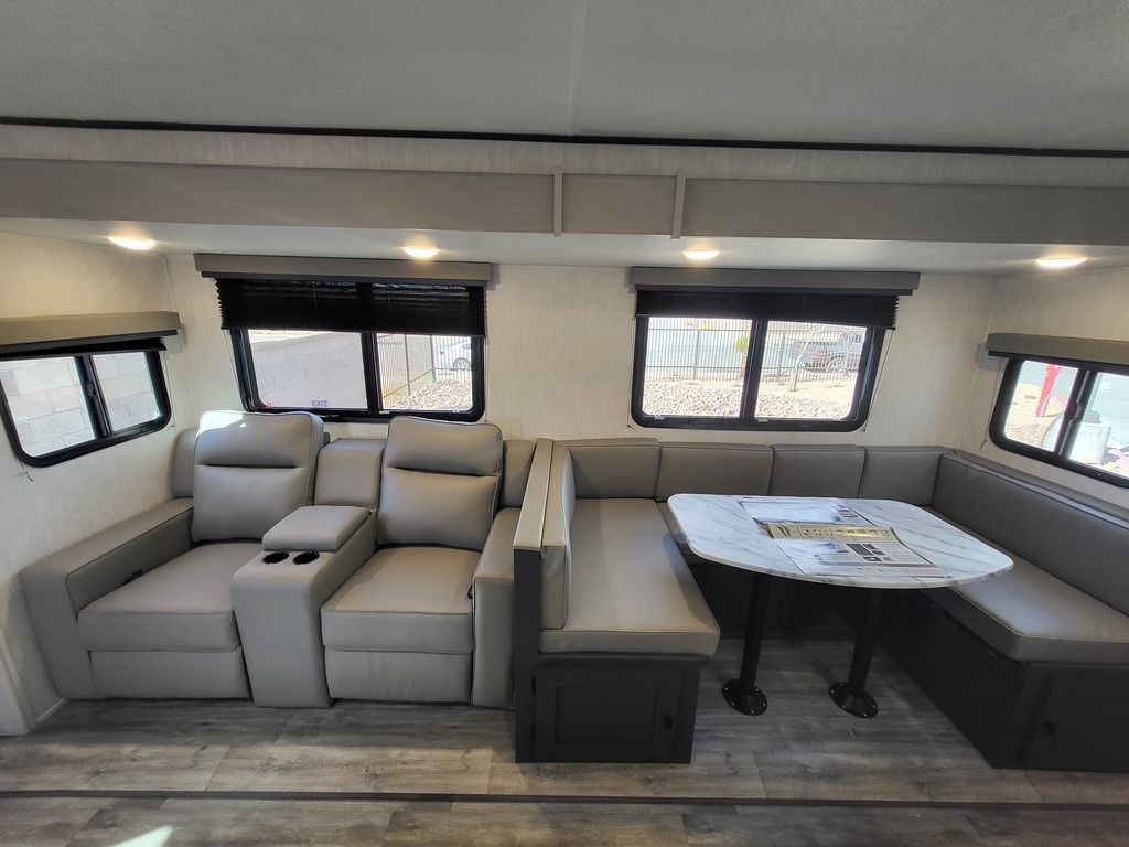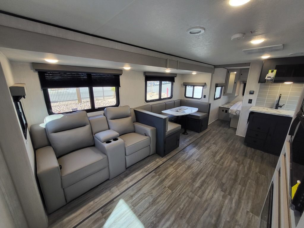 Just inside the door the amenities of this 30’ coach are apparent. The full walk-in pantry provides plenty of space for coats, shoes, vacuums, etc. The rear bath has sliding door giving you more floor space. The convertible dinette can be used as a booth dinette, u-shaped dinette or extra sleeping space. The large TV is directly viewed from your hide-a-bed sofa or optional theatre seating or recliners.