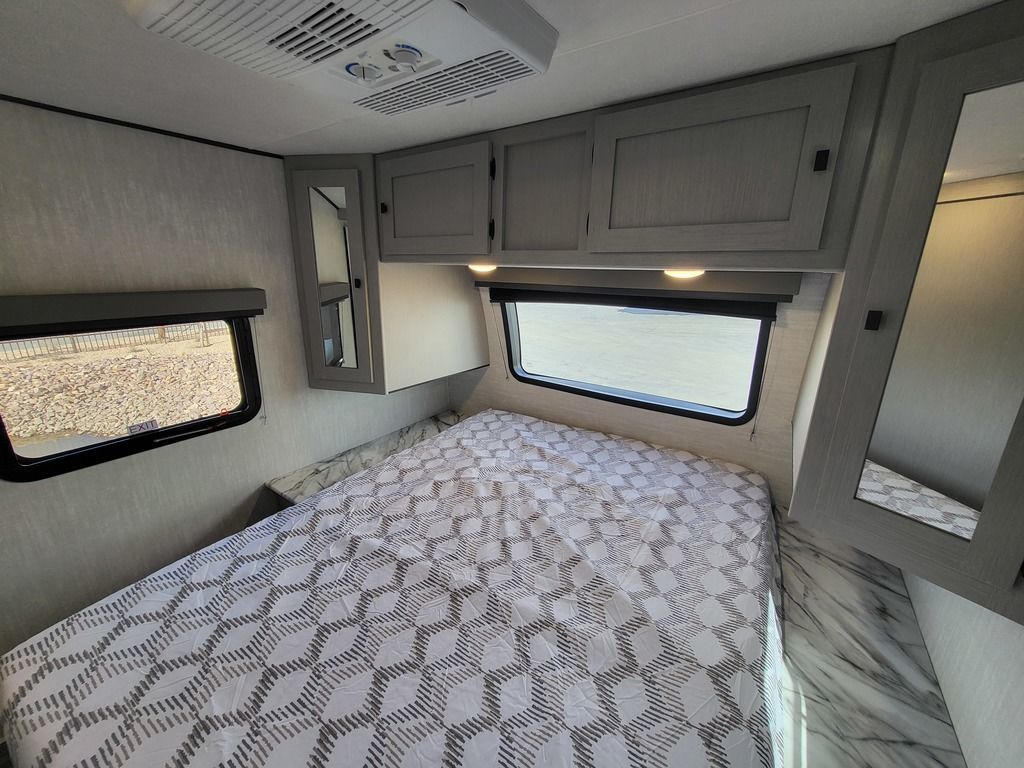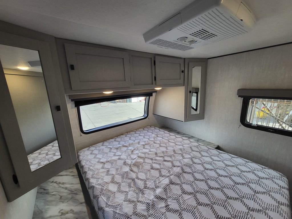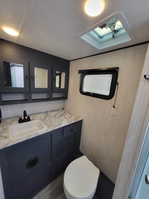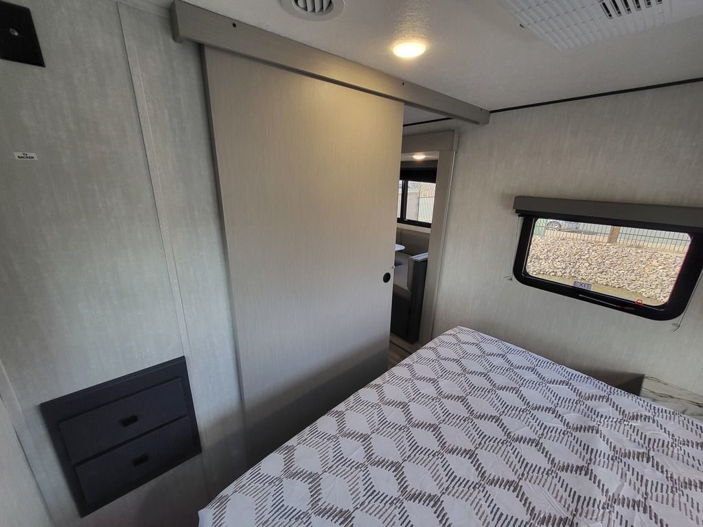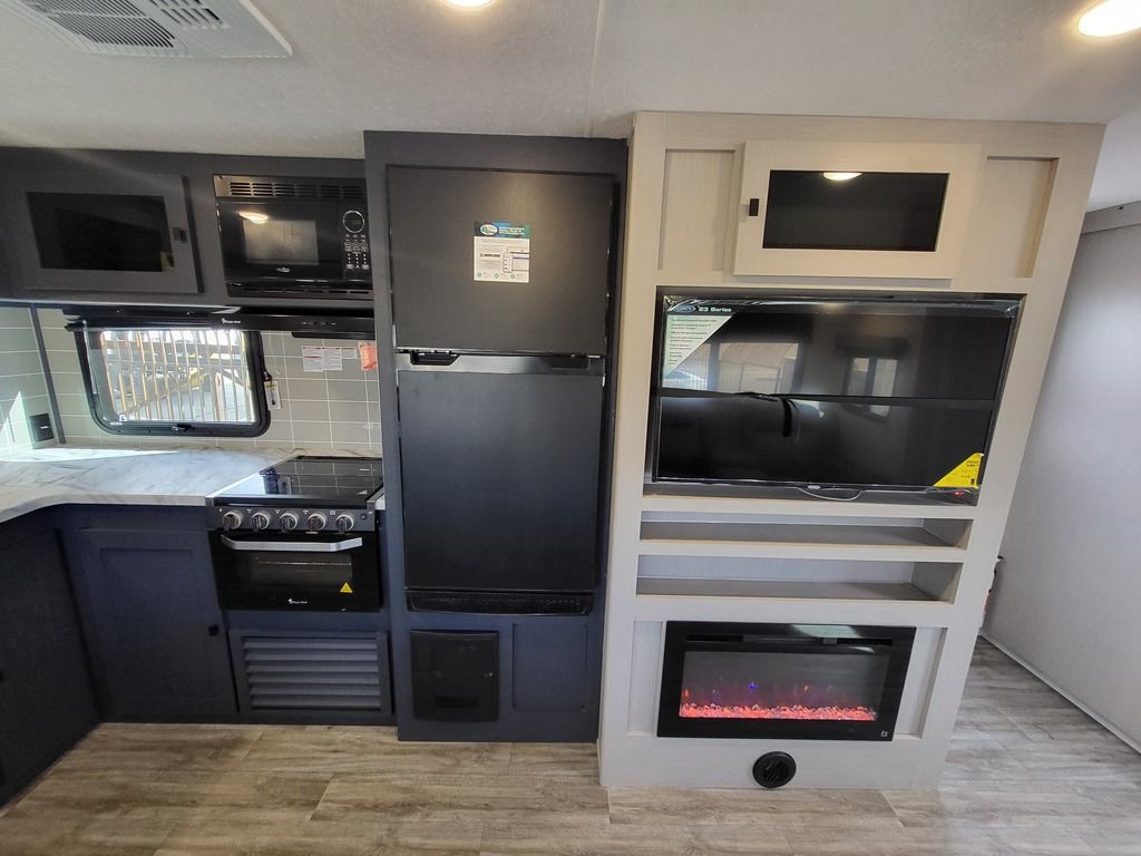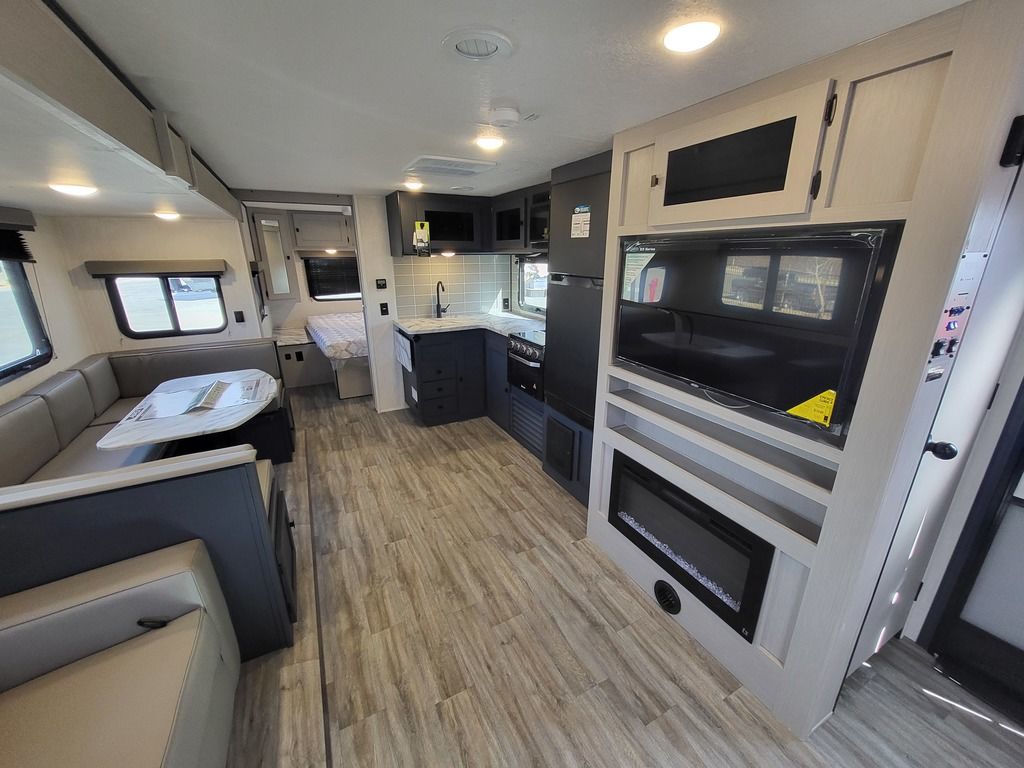 Just inside the door the amenities of this 30’ coach are apparent. The full walk-in pantry provides plenty of space for coats, shoes, vacuums, etc. The rear bath has sliding door giving you more floor space. The convertible dinette can be used as a booth dinette, u-shaped dinette or extra sleeping space. The large TV is directly viewed from your hide-a-bed sofa or optional theatre seating or recliners.