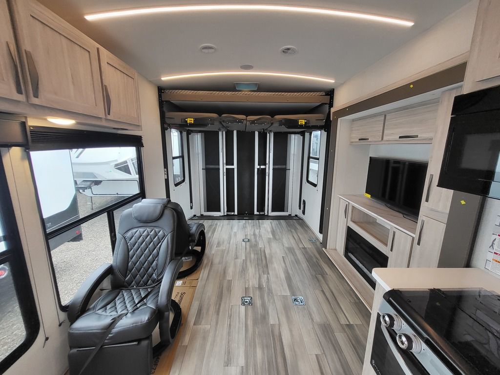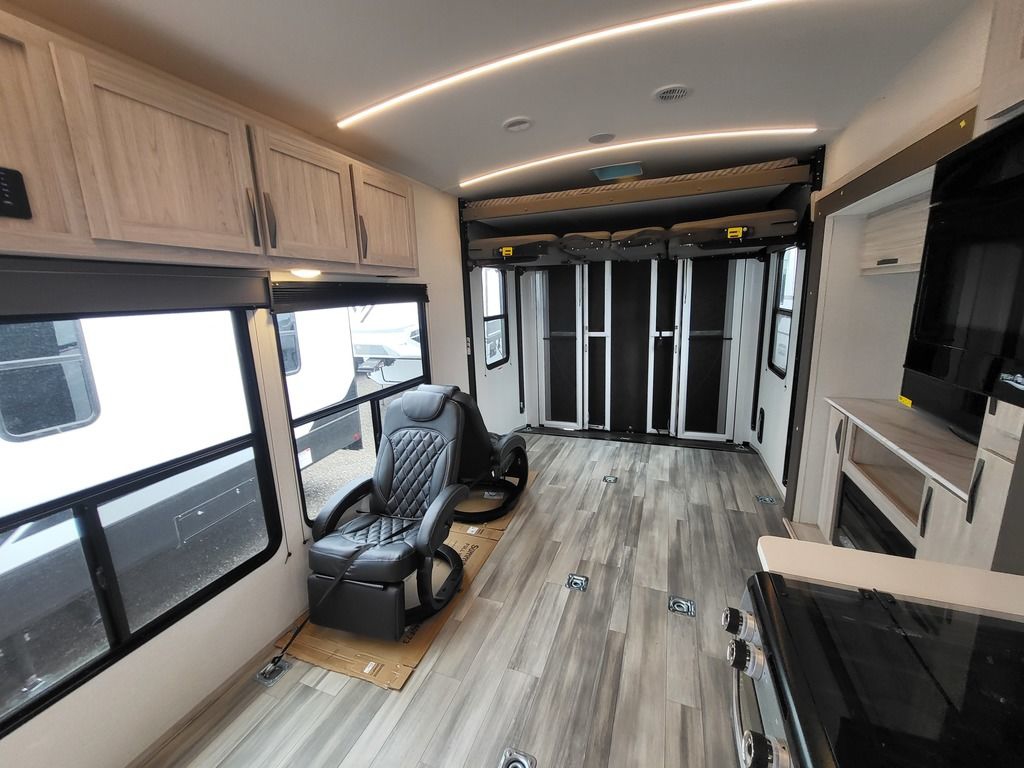 - Dual power Happi-Jac opposing sofa beds in garages w/ queen bed above