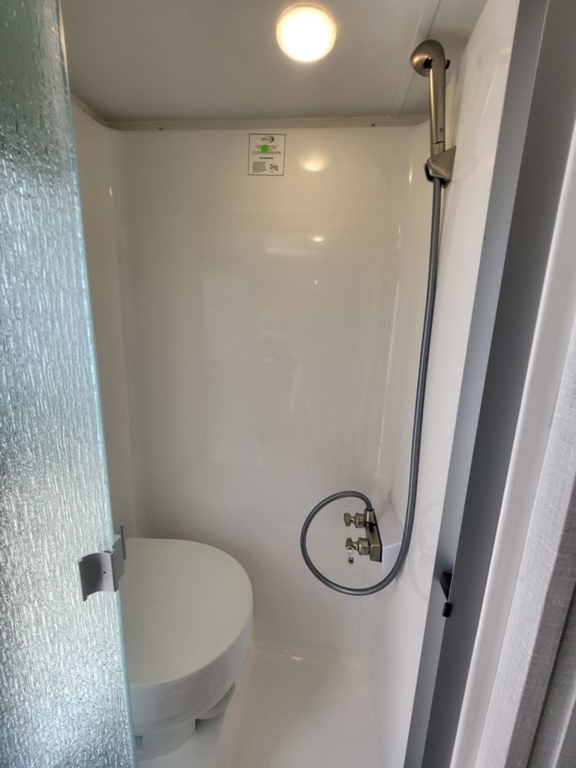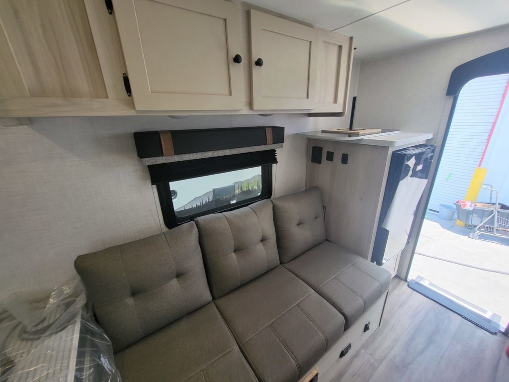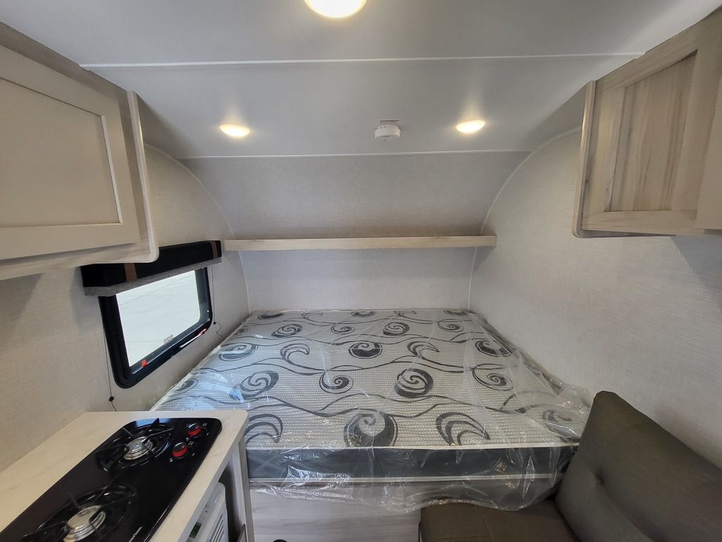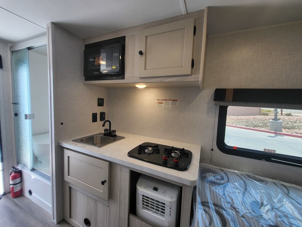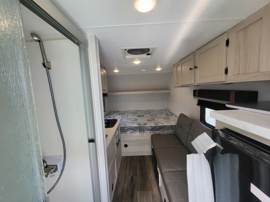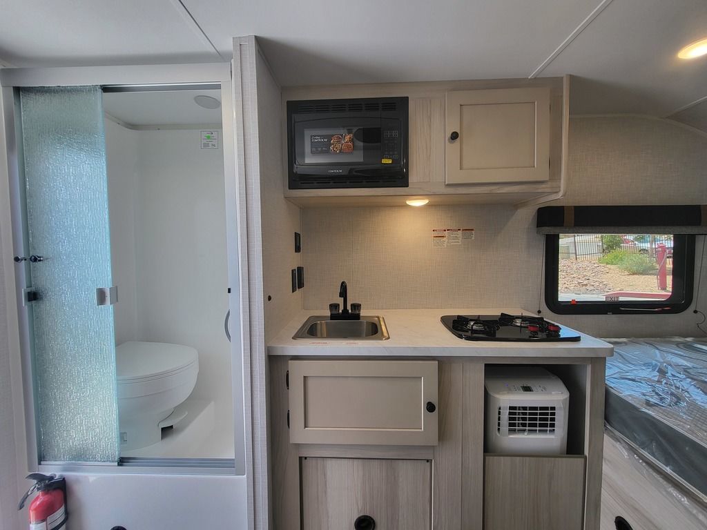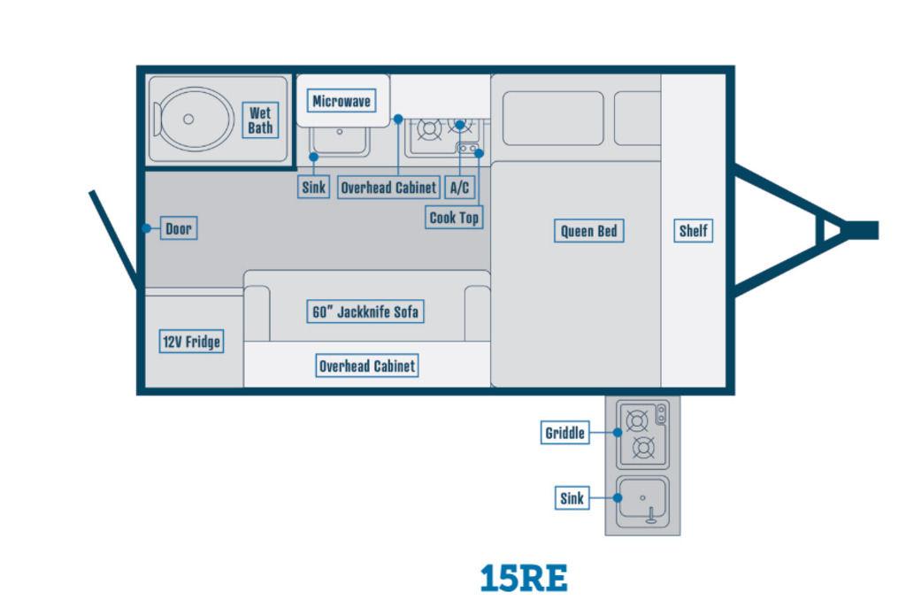 is equipped with features like a jackknife sofa, queen bed, and a wet bath with a shower and toilet. It includes a kitchen area with a two-burner cooktop, refrigerator, and microwave.