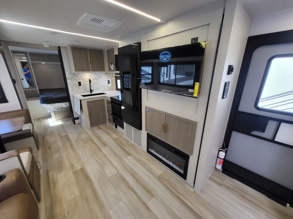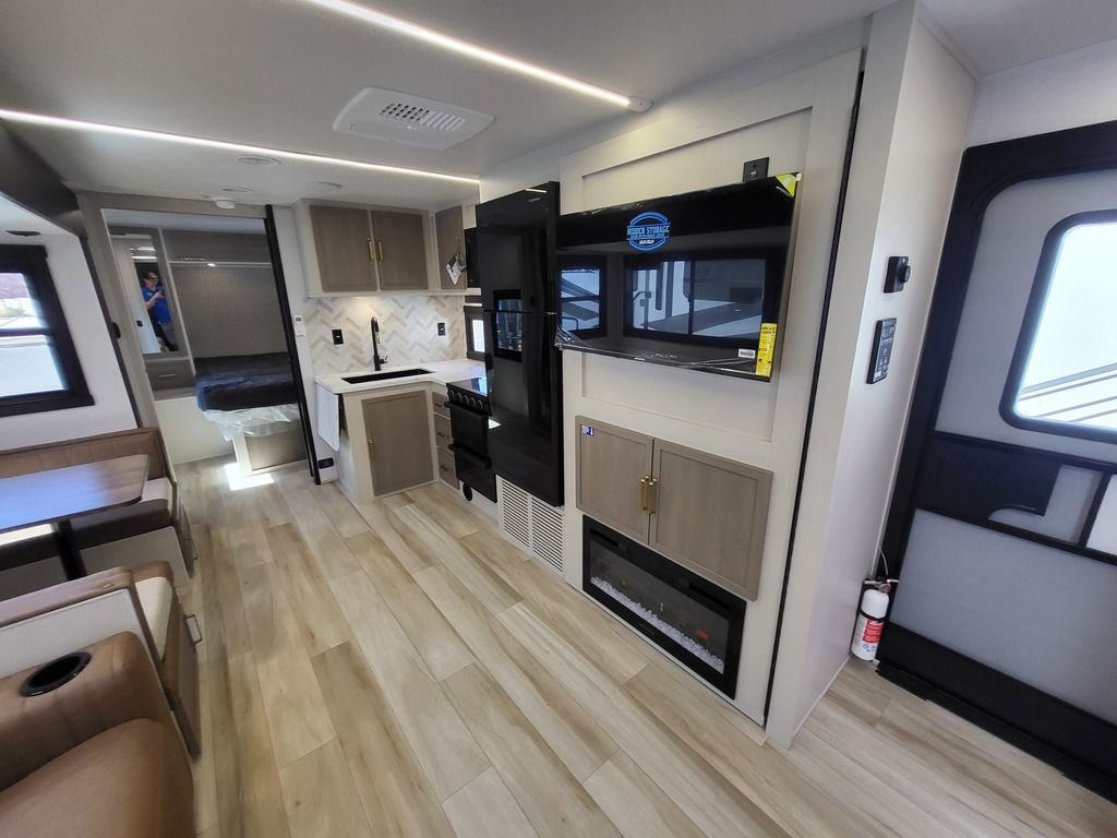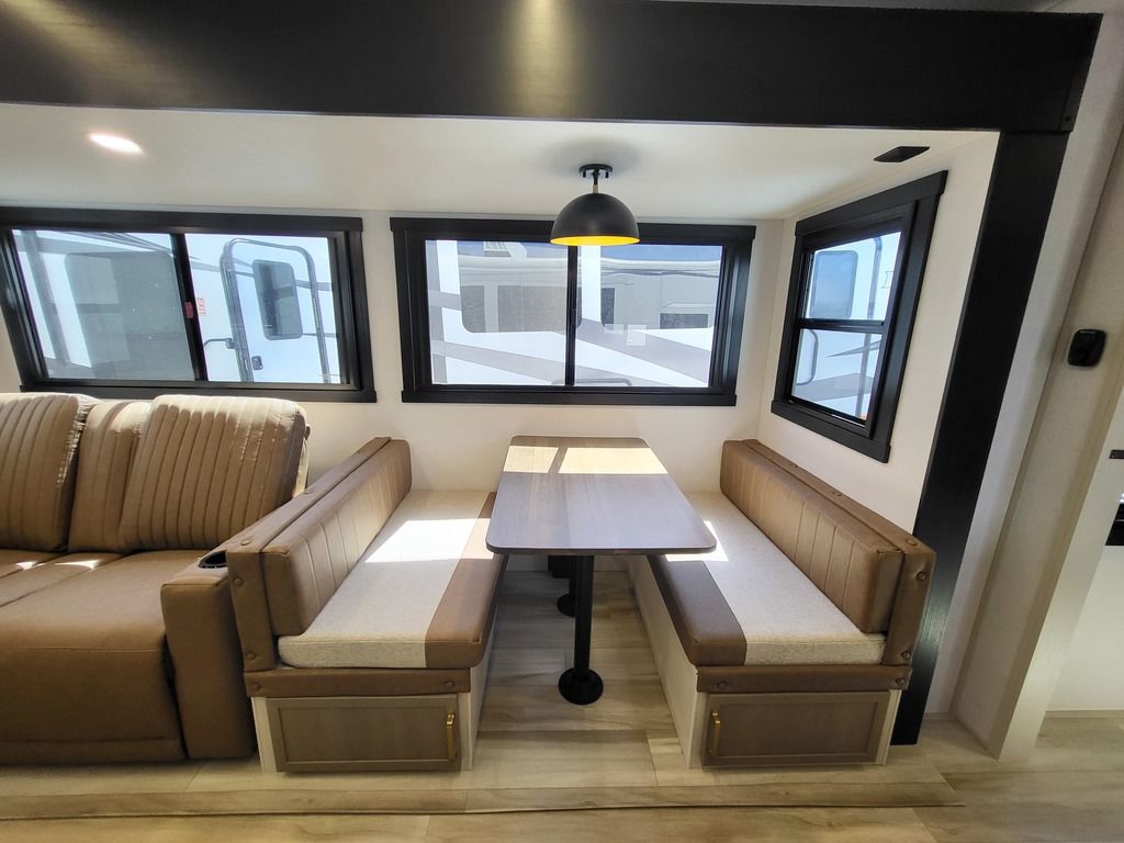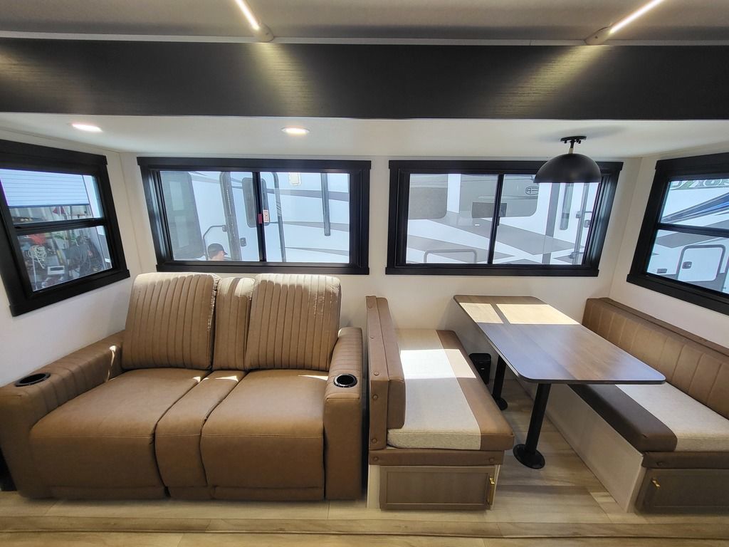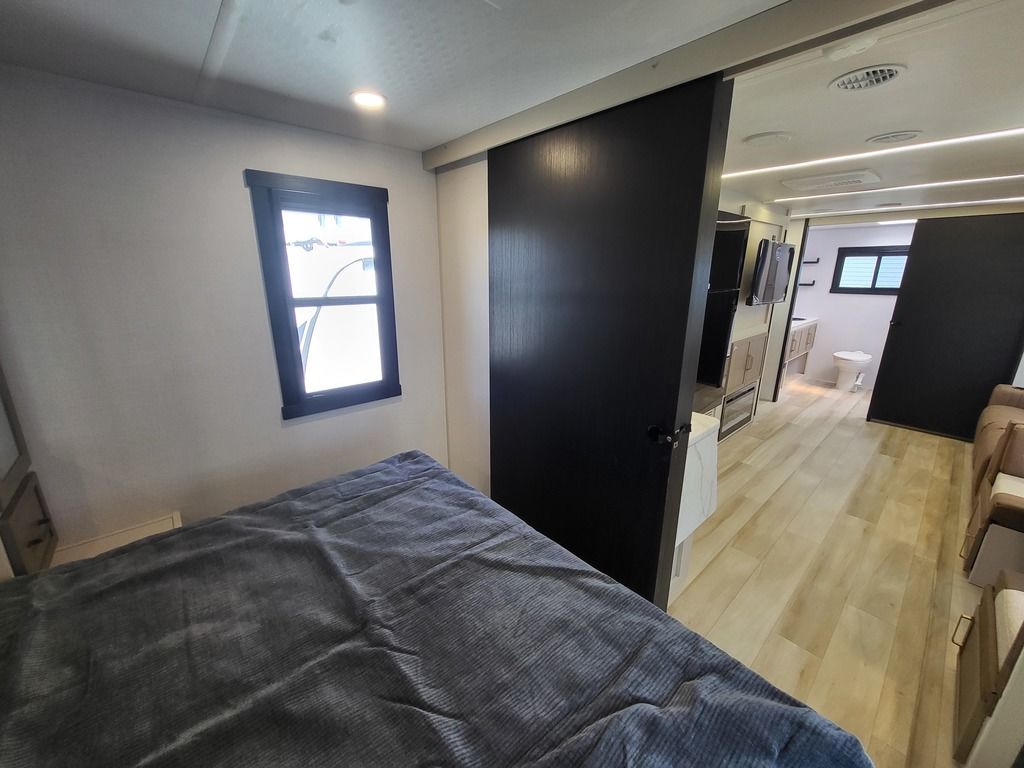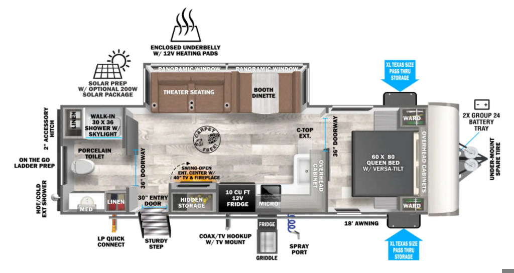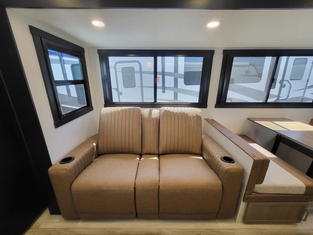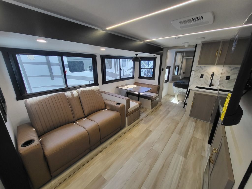 No corners were cut in the 25RBHL. The theater seat (facing the entertainment center) and full-sized dinette separate the best-in-class bathroom and bedroom. 36" wide sliding barn doors offer complete privacy, or the ability to open the 25RBHL up from front to back. This camper also offers a refrigerator outside underneath the awning.