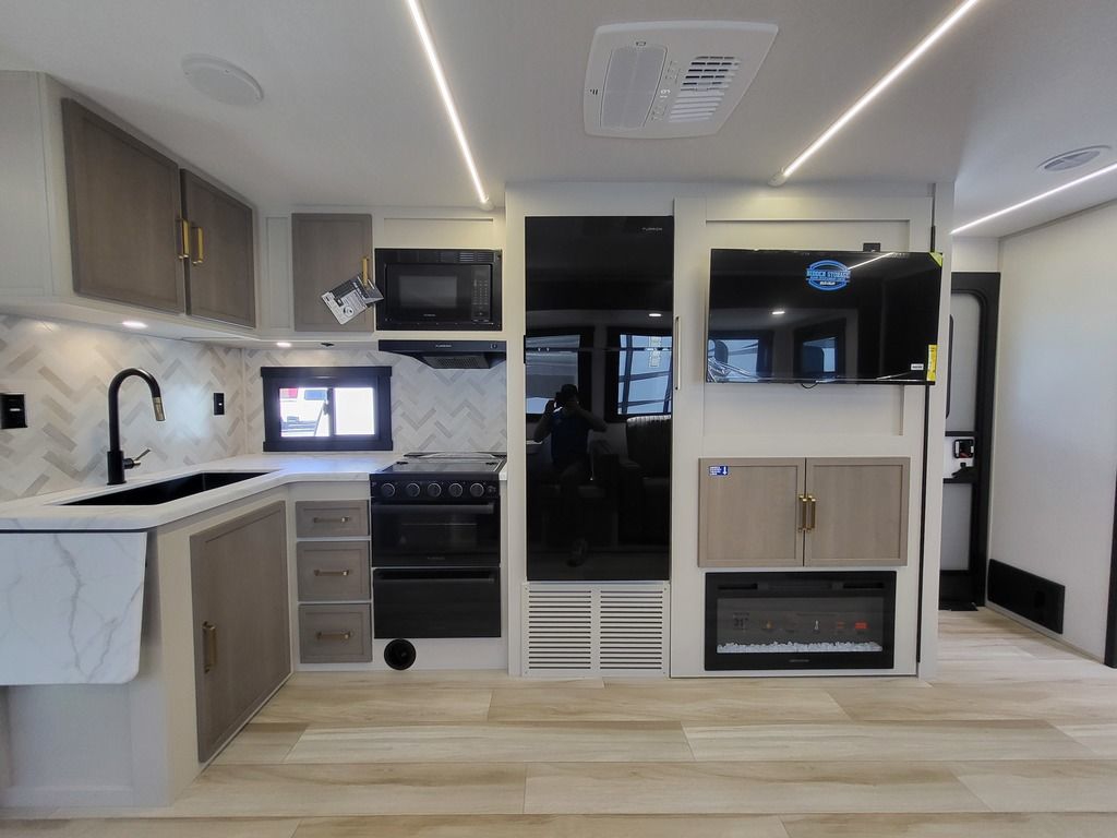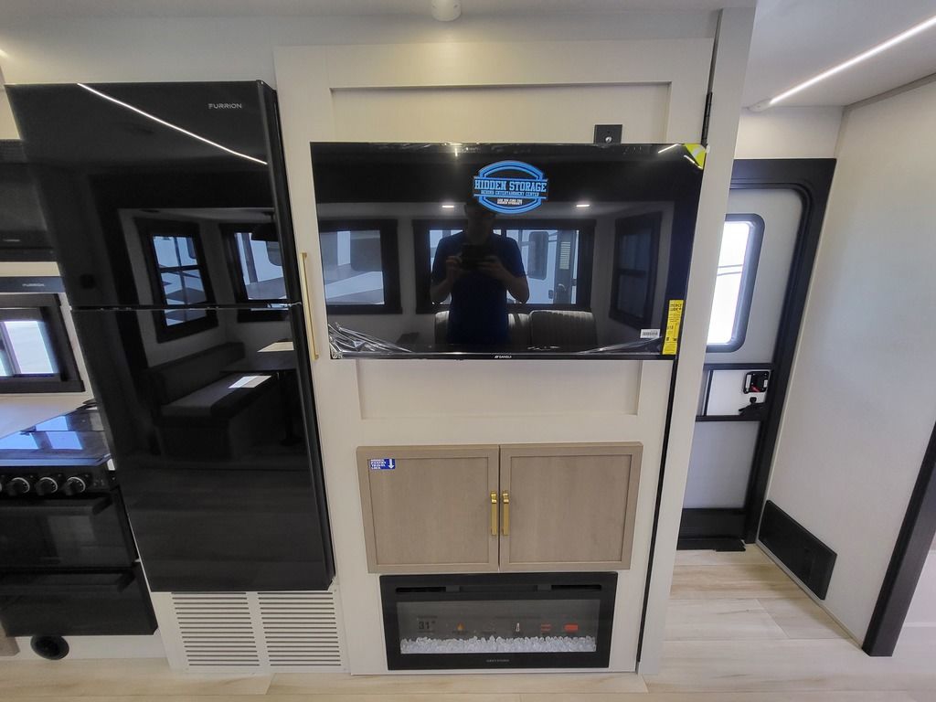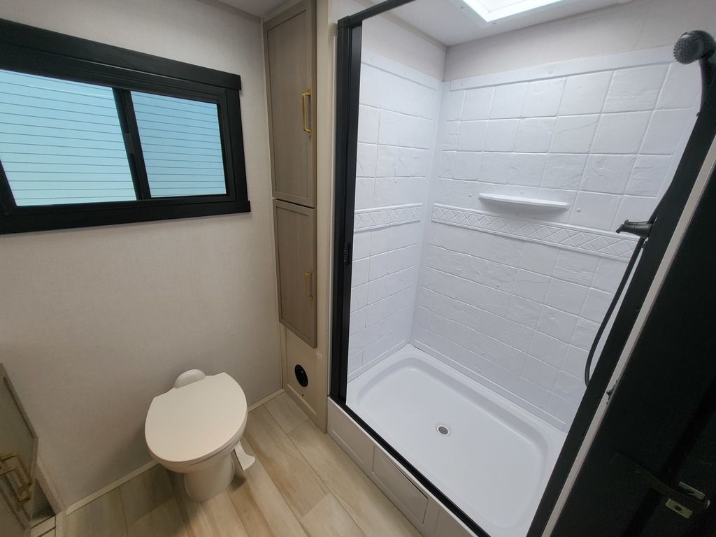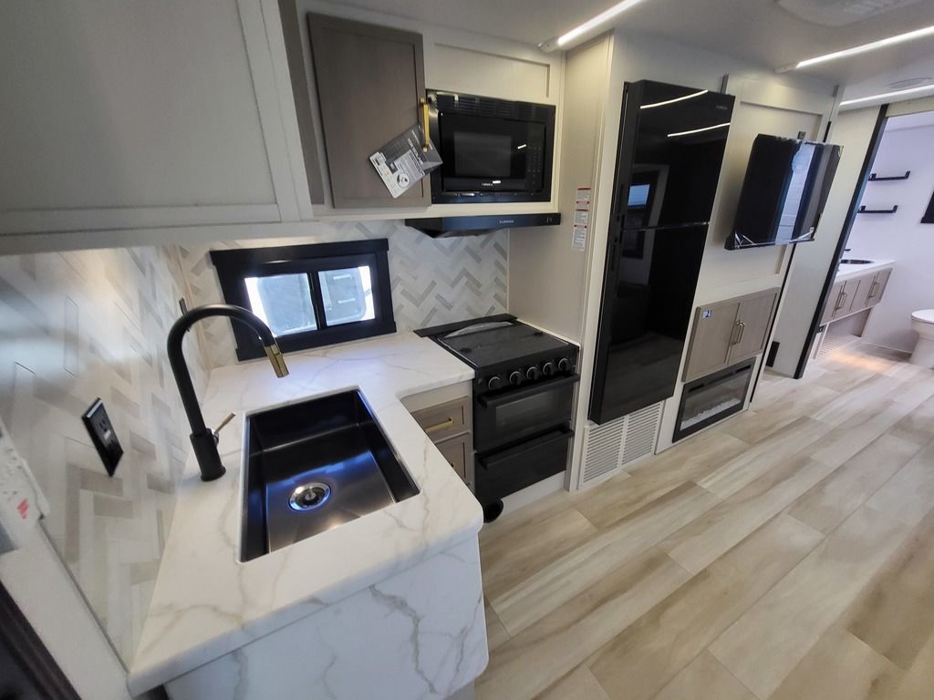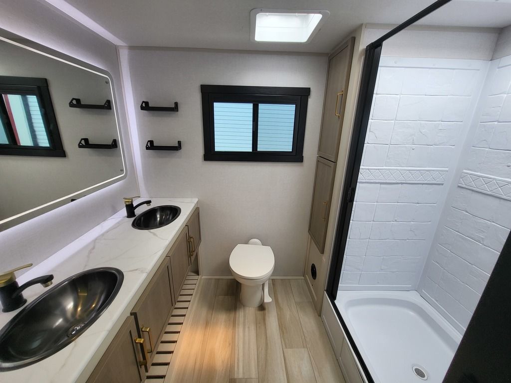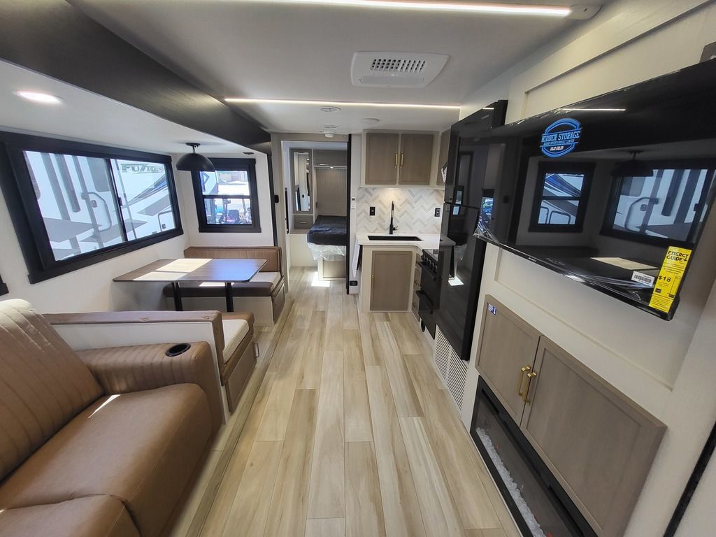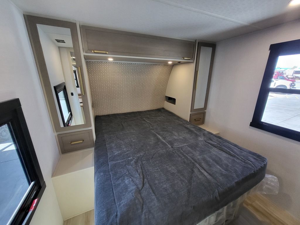 No corners were cut in the 25RBHL. The theater seat (facing the entertainment center) and full-sized dinette separate the best-in-class bathroom and bedroom. 36" wide sliding barn doors offer complete privacy, or the ability to open the 25RBHL up from front to back. This camper also offers a refrigerator outside underneath the awning.