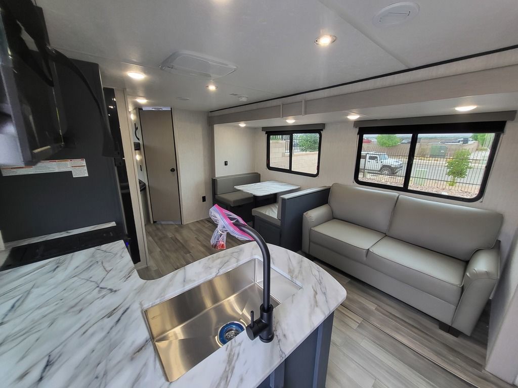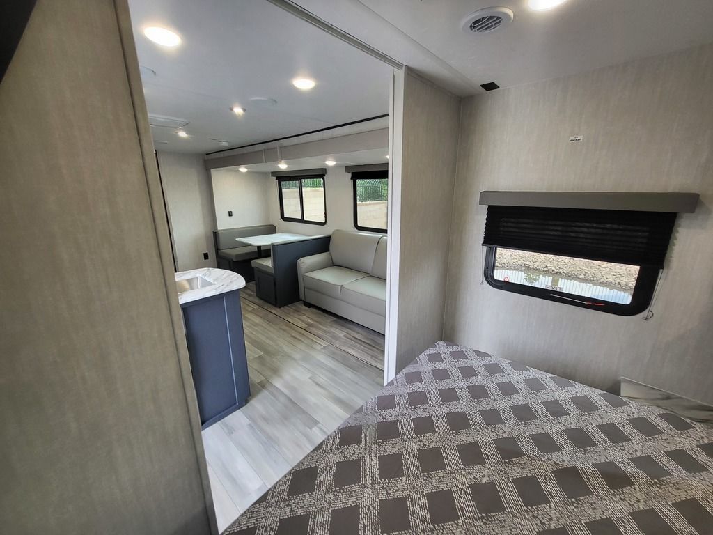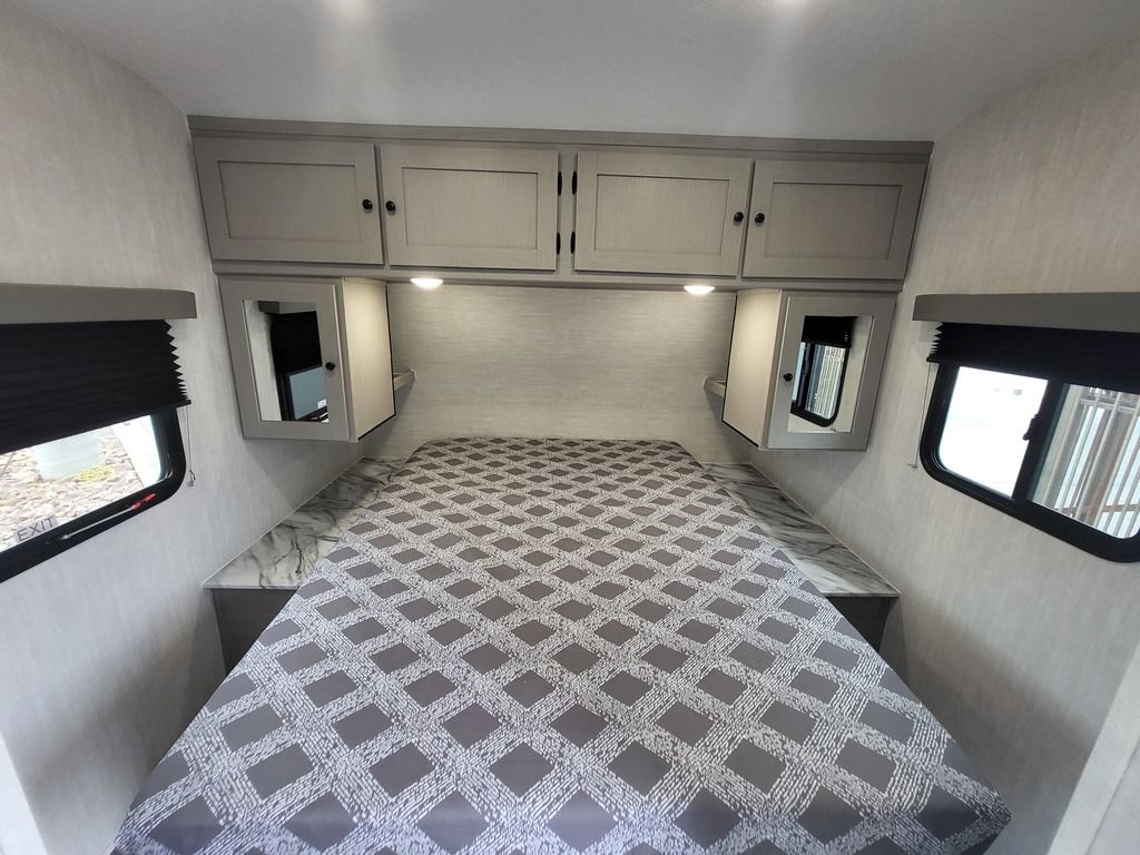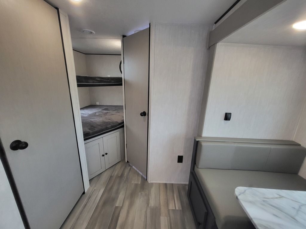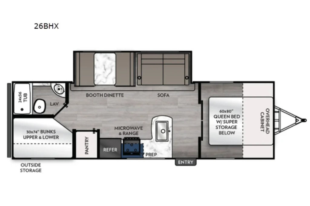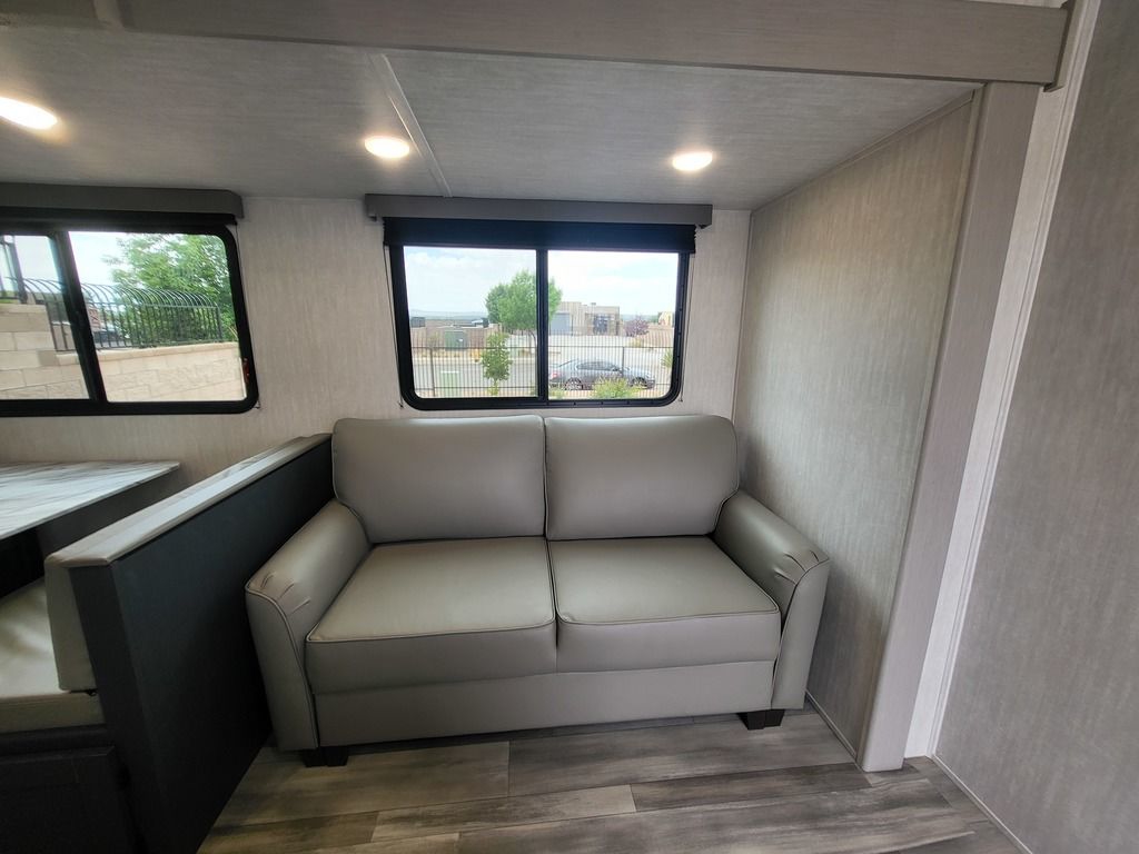 Make each camping trip count in this spacious travel trailer! You will love having your own bedroom up front that includes a queen bed with super storage below plus an overhead cabinet for books and more. A large slide out in the combined kitchen and living area houses the sofa and booth dinette, and these pieces of furniture can double as sleeping space for guests as well. The chef of your group will appreciate the L-shaped kitchen counter with a large sink, a microwave and range plus a refrigerator and pantry for food storage. This unit also includes 30" x 74" double-size bunks for your guests or kids!