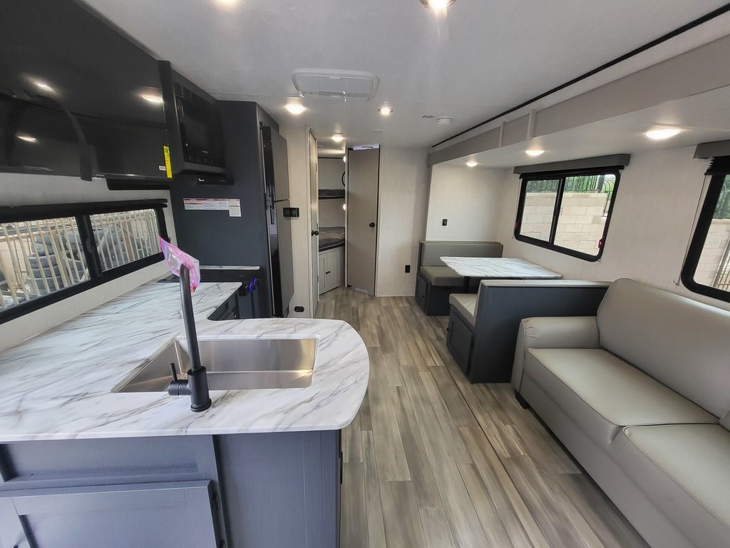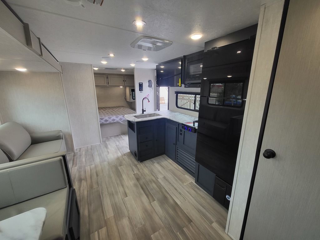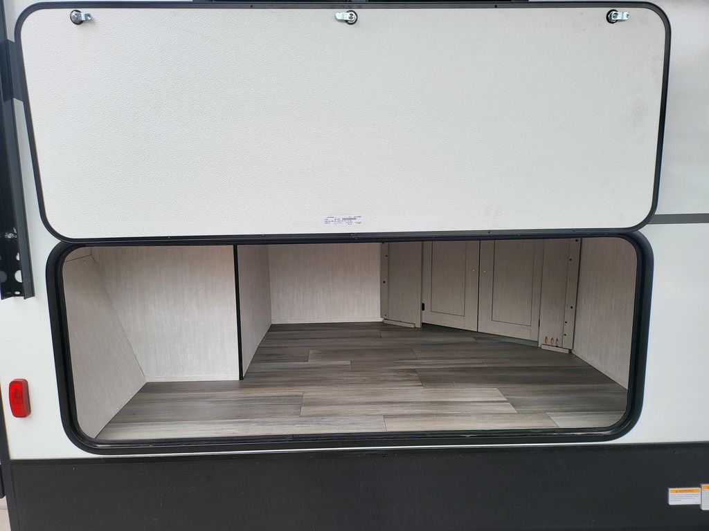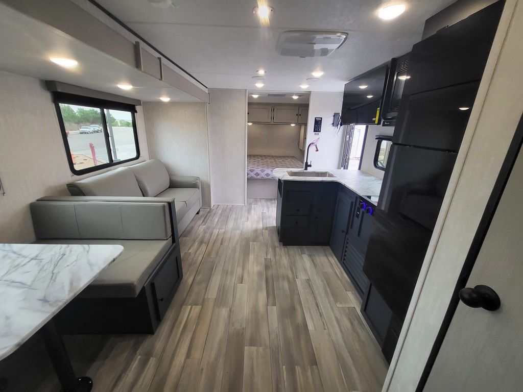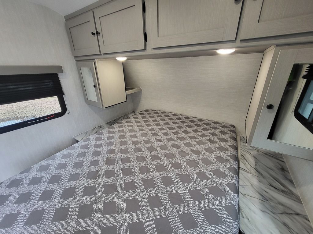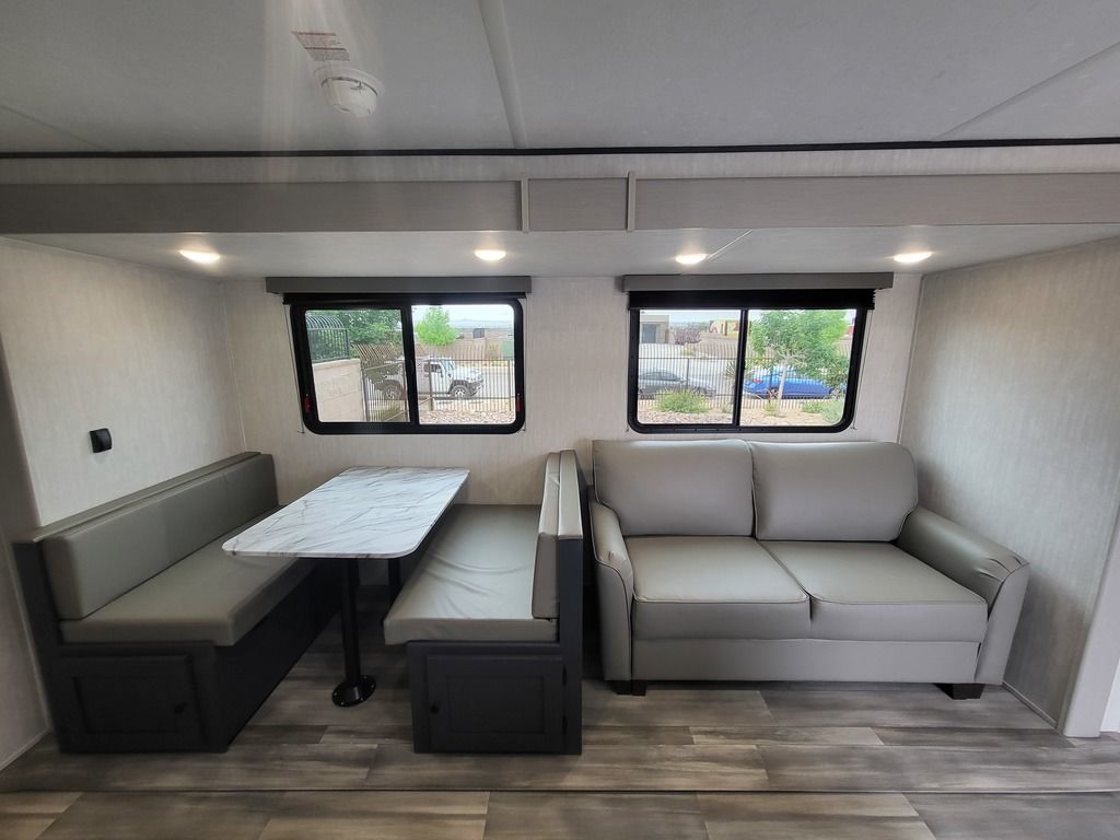 Make each camping trip count in this spacious travel trailer! You will love having your own bedroom up front that includes a queen bed with super storage below plus an overhead cabinet for books and more. A large slide out in the combined kitchen and living area houses the sofa and booth dinette, and these pieces of furniture can double as sleeping space for guests as well. The chef of your group will appreciate the L-shaped kitchen counter with a large sink, a microwave and range plus a refrigerator and pantry for food storage. This unit also includes 30" x 74" double-size bunks for your guests or kids!
