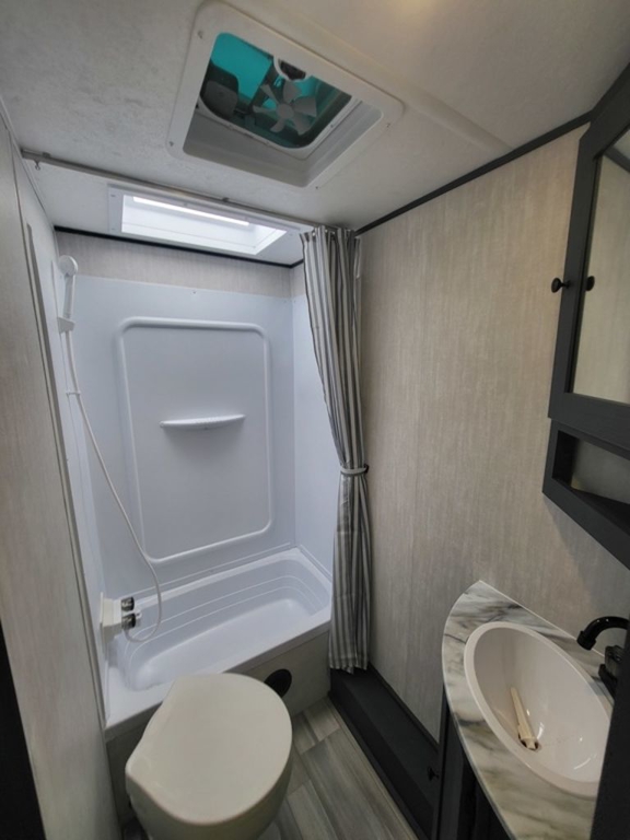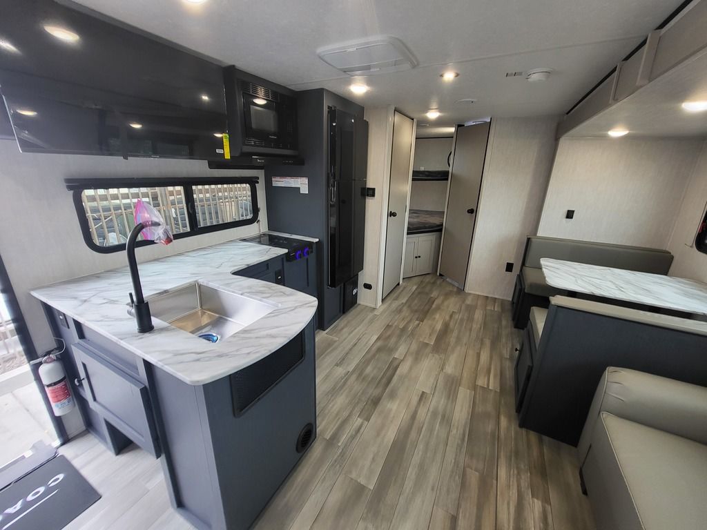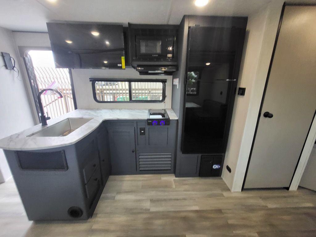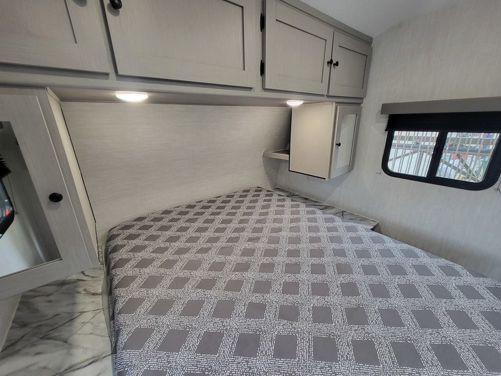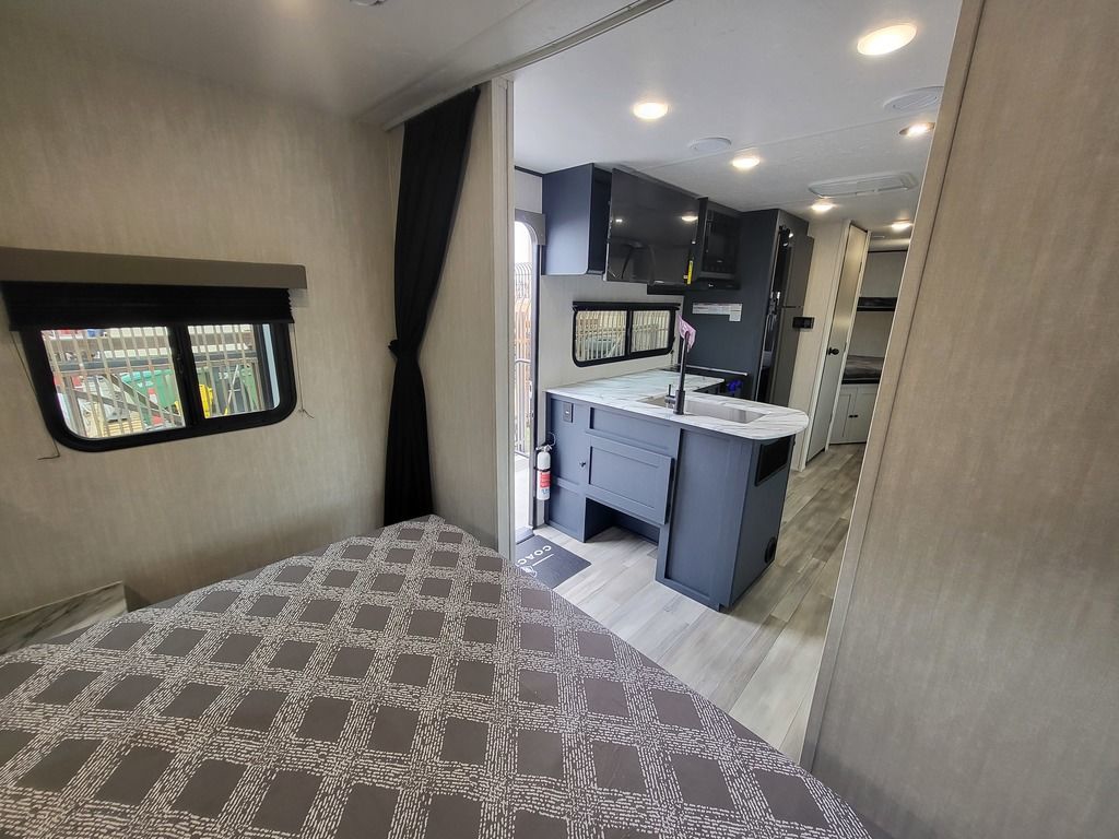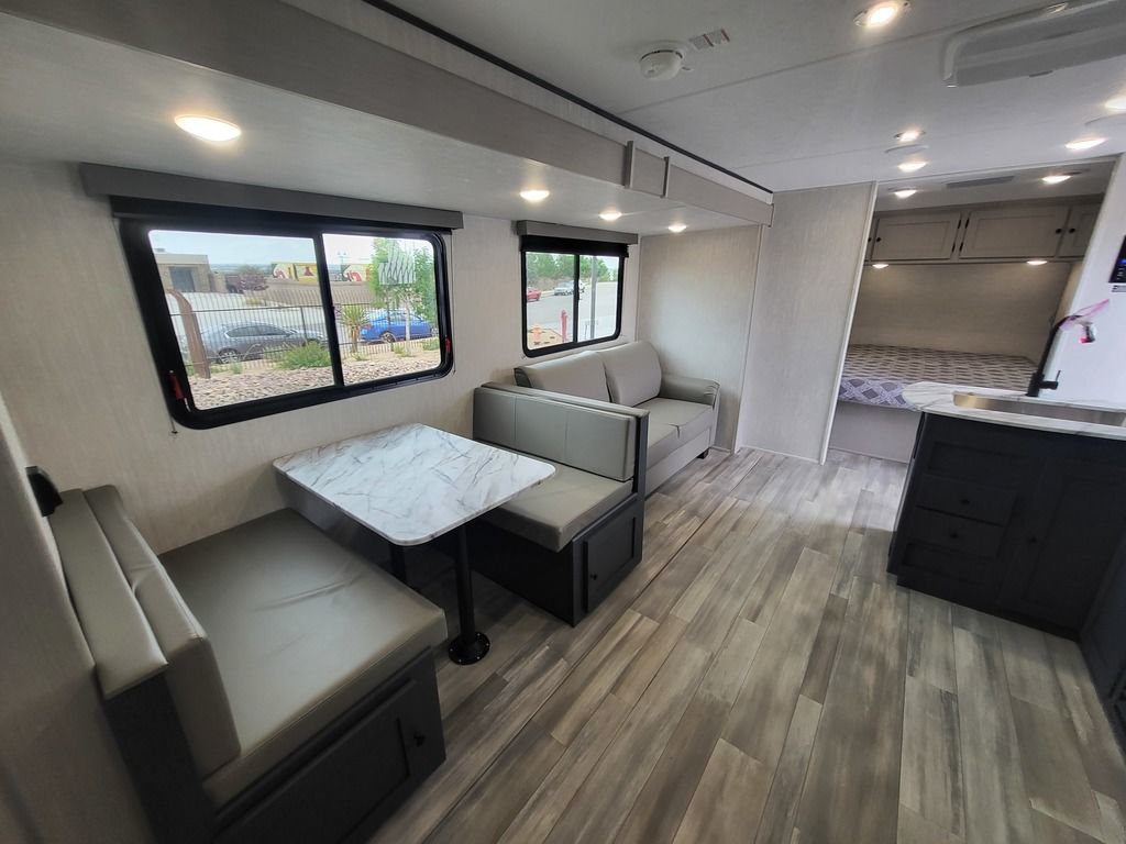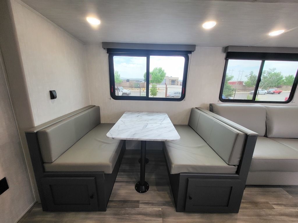 Make each camping trip count in this spacious travel trailer! You will love having your own bedroom up front that includes a queen bed with super storage below plus an overhead cabinet for books and more. A large slide out in the combined kitchen and living area houses the sofa and booth dinette, and these pieces of furniture can double as sleeping space for guests as well. The chef of your group will appreciate the L-shaped kitchen counter with a large sink, a microwave and range plus a refrigerator and pantry for food storage. This unit also includes 30" x 74" double-size bunks for your guests or kids!