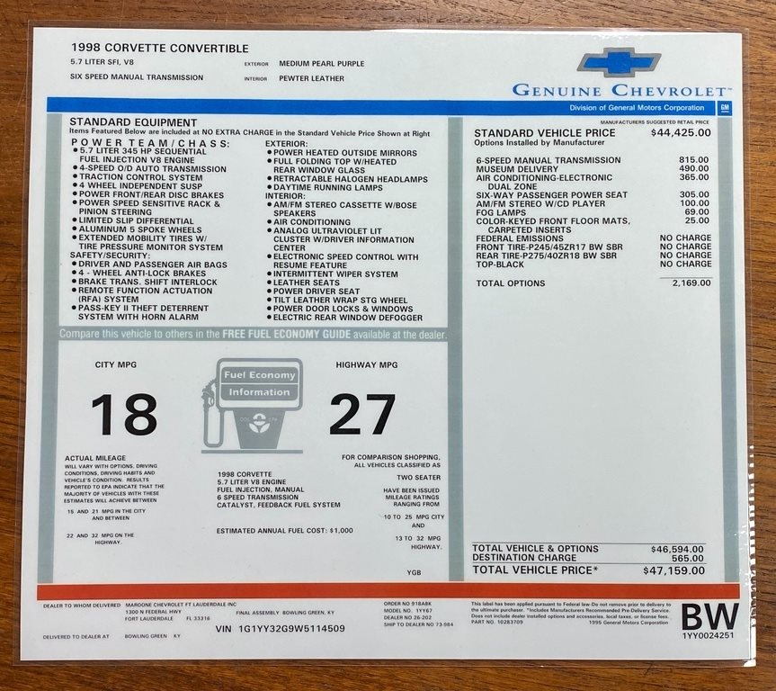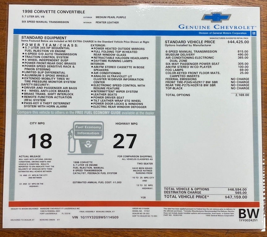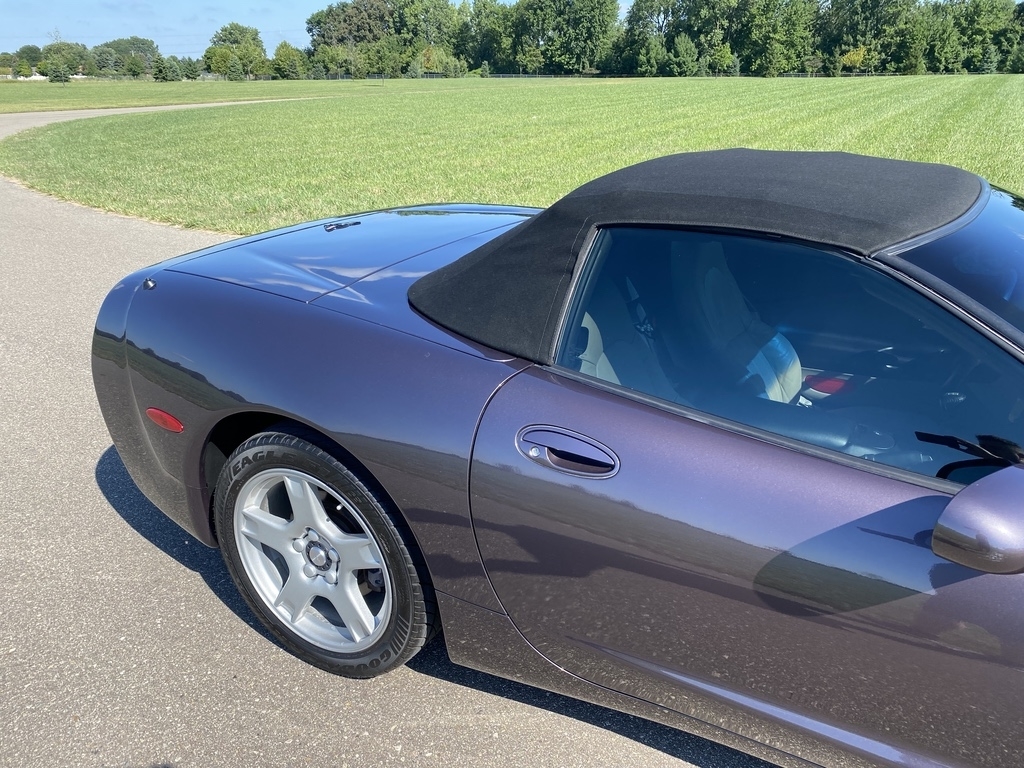 General Motors produced a total of 31,084 Corvettes in 1998. This included both Coupes and Convertibles. ONLY 381 were painted in this stunning shade of Medium Pearl Purple, Code 95. That is just a little over 1%. To break it down even further, only 146 were Convertibles. Out of those 146, how many were equipped with the 6 Speed Manual Transmission? How many have the Light Gray Interior out of the three available interior colors? Pictures and Videos were taken on two separate days. One day was cloudy and the next day was full sunlight. This shows how different this rare color looks in different lighting.