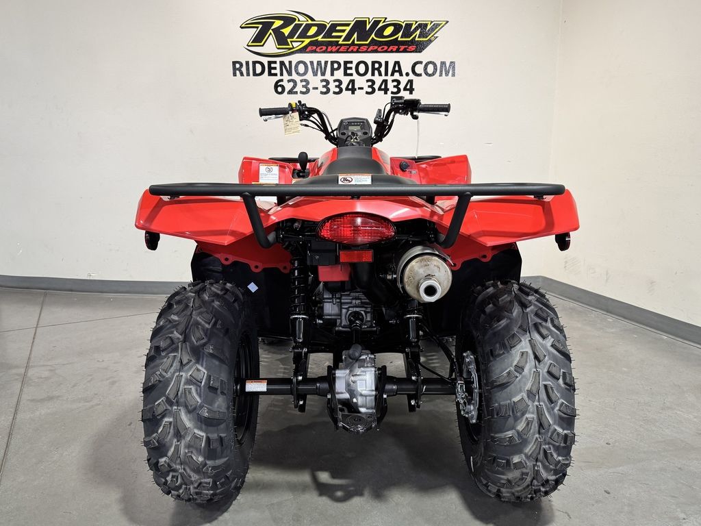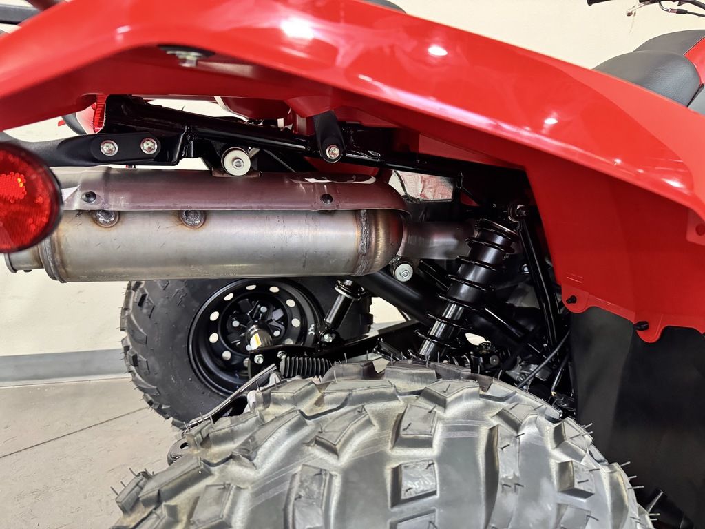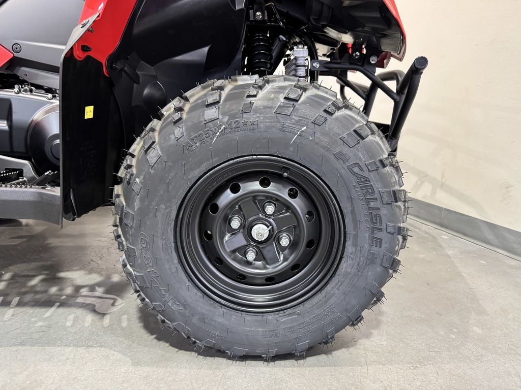 Sporty Flame Red or natural Terra Green bodywork features sharply angled, high-clearance fenders while the full steel cargo racks help tackle any outdoors task.