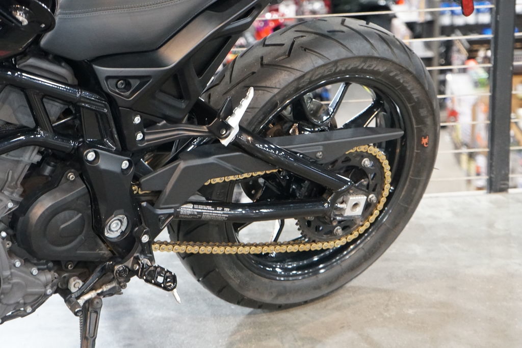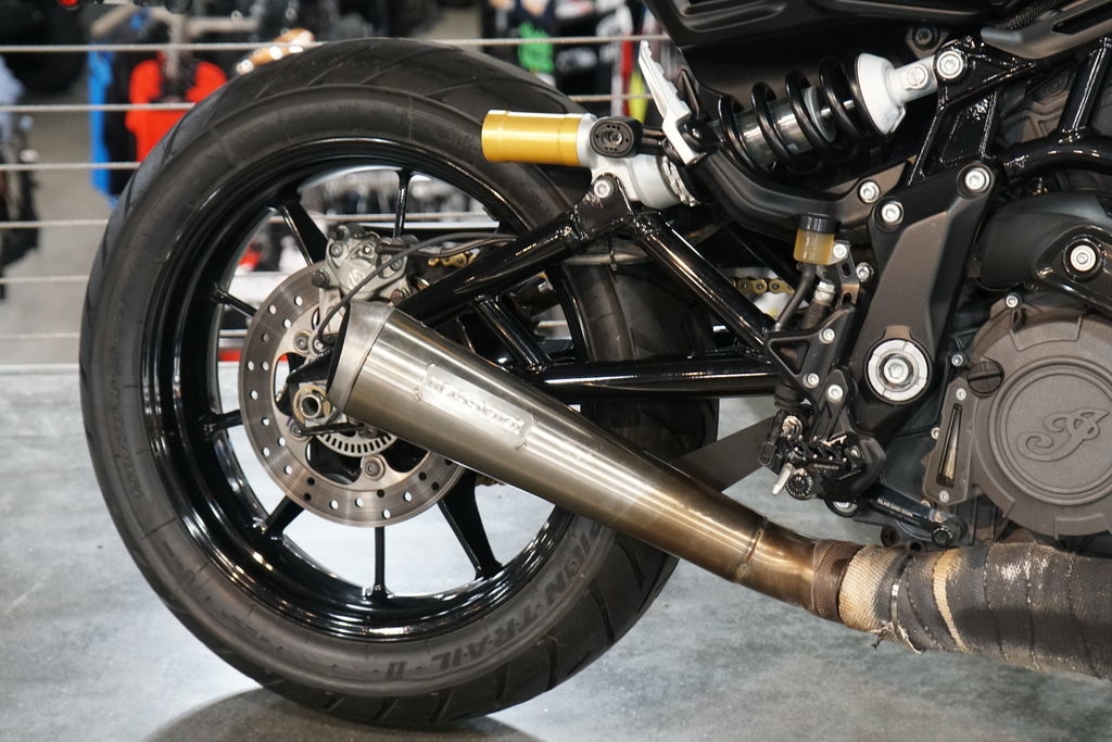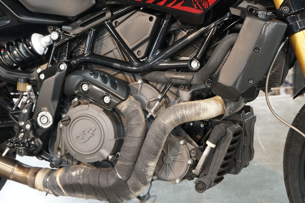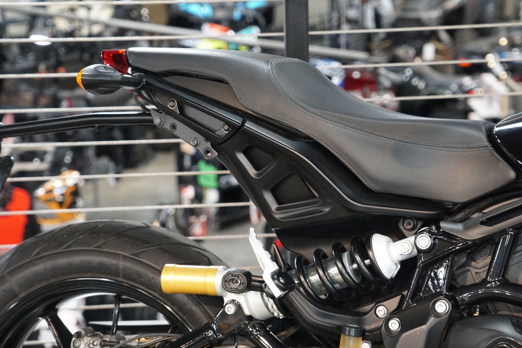 The rear swingarm design and tank silhouette are just a few of the elements borrowed from the FTR750 race bike.