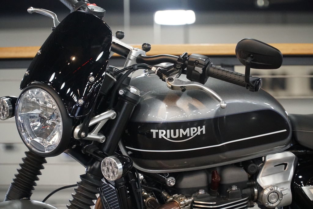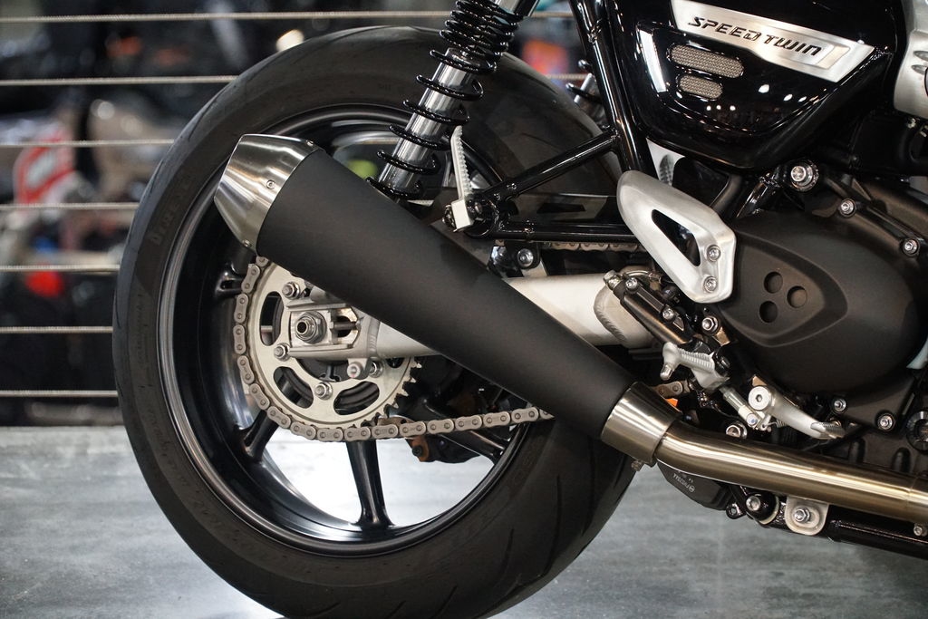 Contemporary black megaphone twin upswept sports silencers contribute to the thrilling deep British roar that lives up to the Speed Twin’s legendary name. Triumph’s innovative uninterrupted flowing exhaust header run contains a hidden cat box.