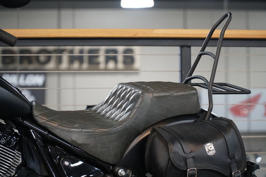 Loaded with attitude and blacked-out finishes from fender to bobbed fender. A welded steel tube frame, large headlight bucket with nallece, and covered forks and rear shocks give a nod to traditional bobber style.
