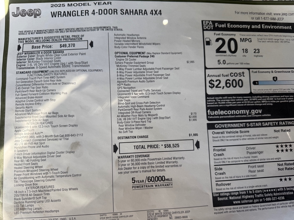 2025 Jeep Wrangler Sahara 4 Door V6 Body Color Hard Top 3.6 L